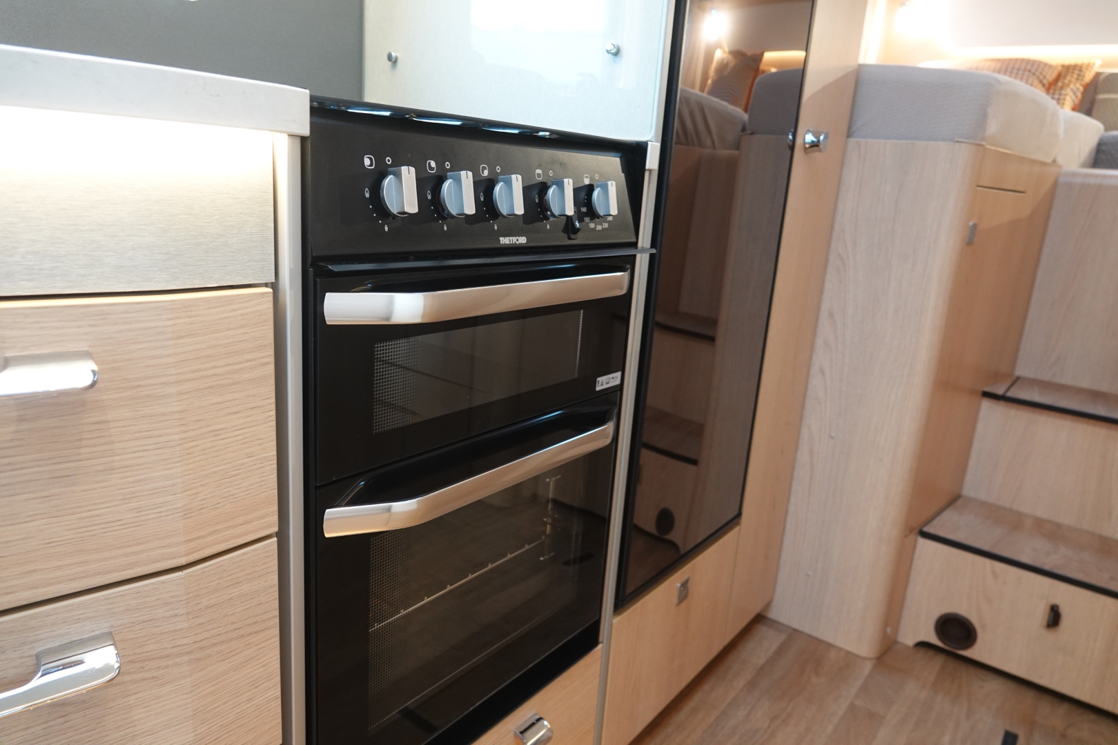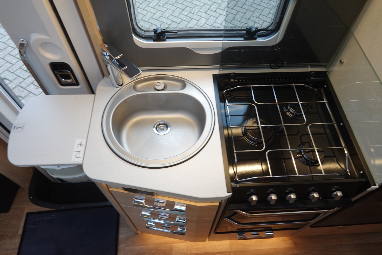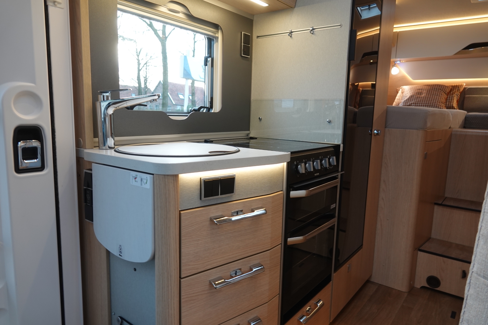 De royale keuken heeft een luxe keukenblad met spoelbak en 3 pits kookfornuis – bakovencombinatie Caprice met automatische ontsteking, diverse gelagerde laden met verrassend veel bergruimte voor het kookgerei en boodschappen, grote Smart Tower koelkast met vriezer, en automatische energiekeuze.