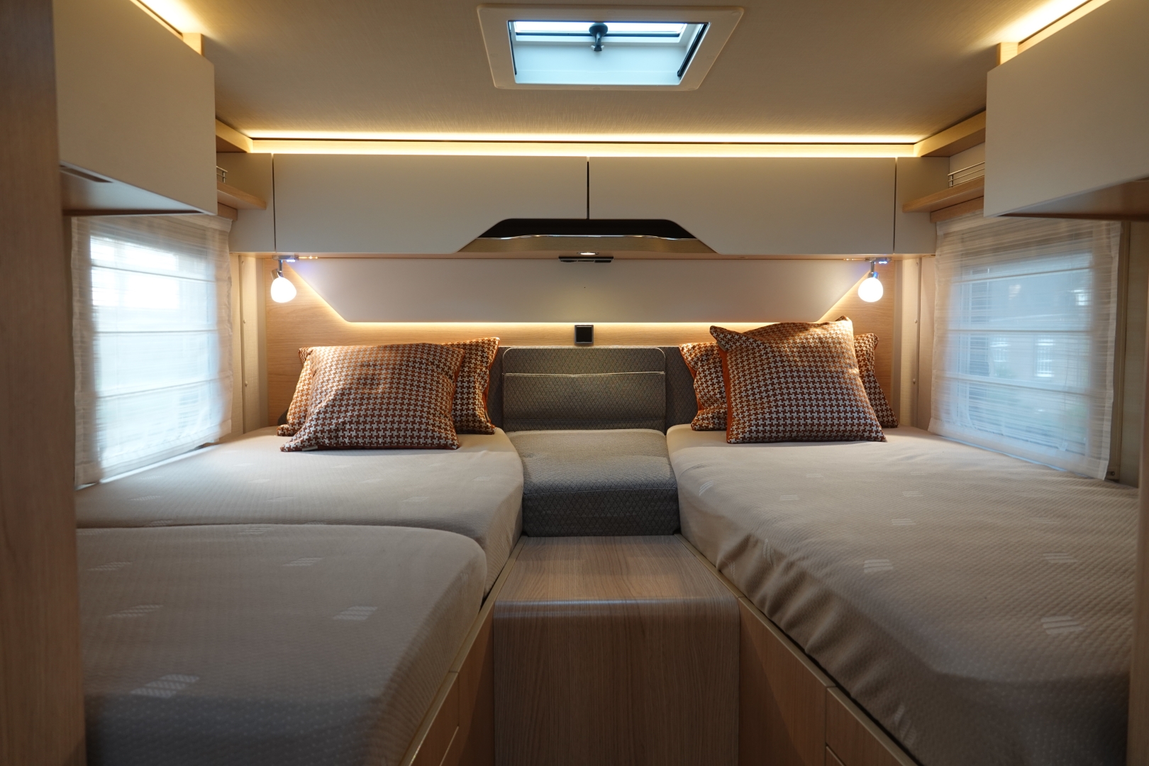 Het slaapgedeelte achterin heeft 2 lengte bedden met traagschuim matras op schotelsysteem voor optimaal slaapcomfort.