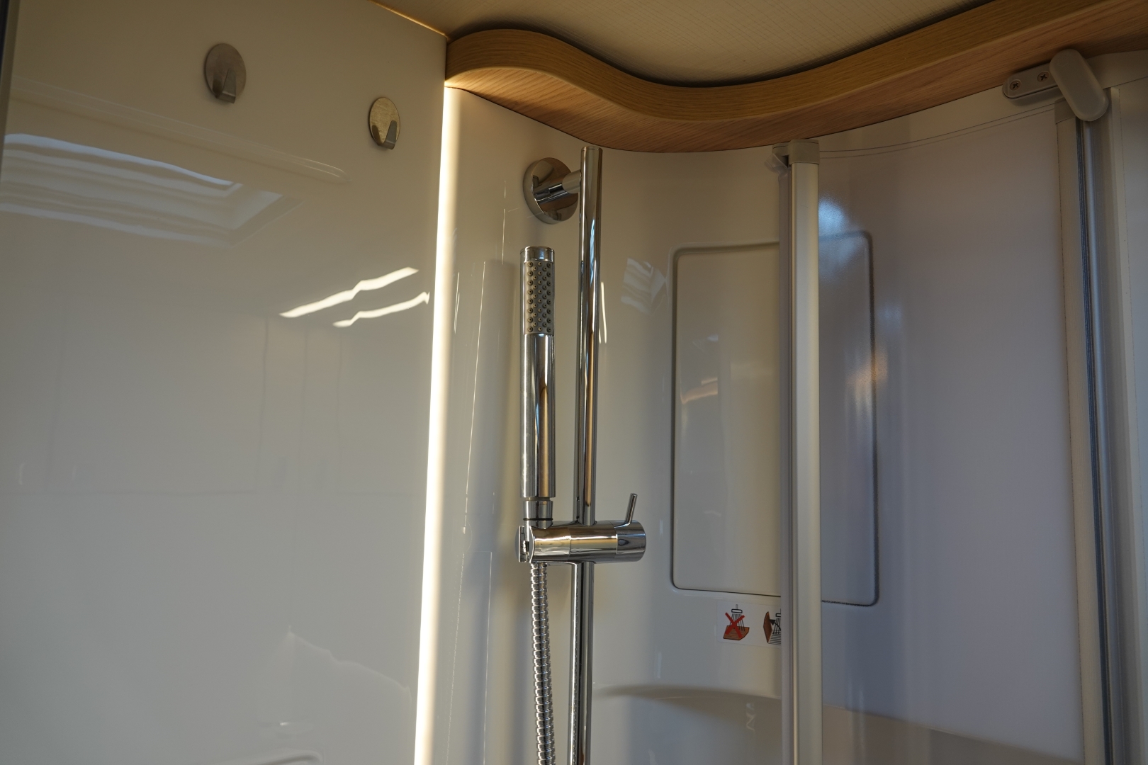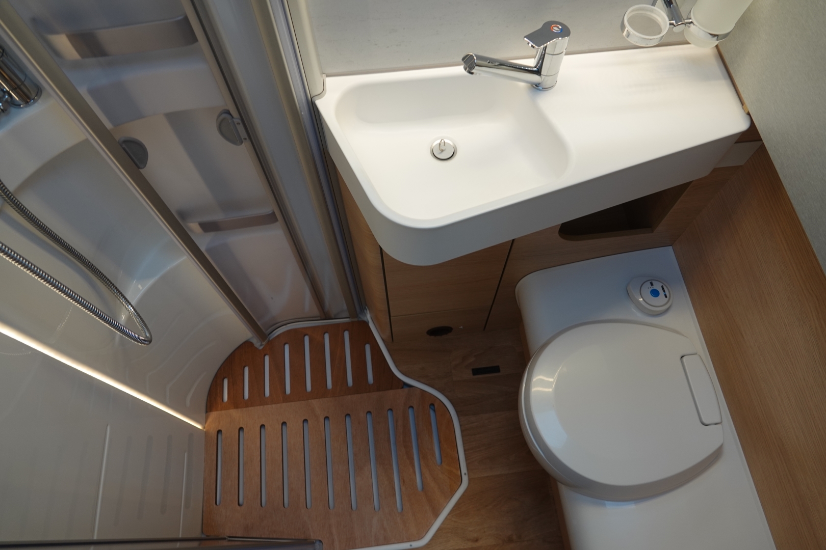 De ruime badkamer met wastafel heeft een Thetford toilet met extra kastruimte en een aparte grote douchecabine.