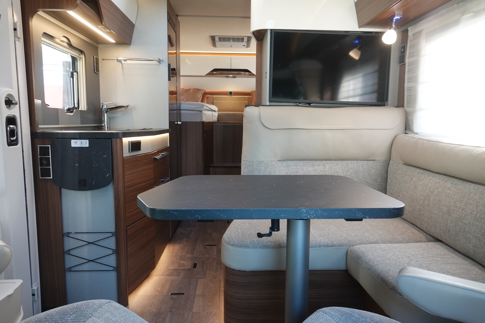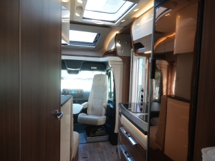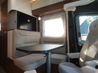 2 comfortabele pilotestoelen in hoogte verstelbaar, draaibaar naar een gezellige zitgroep met luxe salontafel en groot panoramadak er boven.