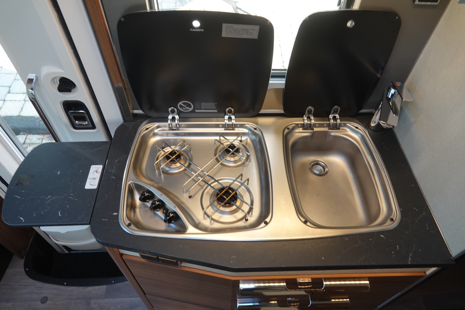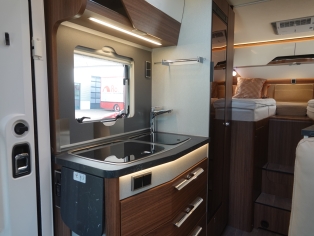 De royale keuken heeft een luxe keukenblad met spoelbak en 3 pits kookfornuis – bakovencombinatie Caprice met automatische ontsteking, diverse gelagerde laden met verrassend veel bergruimte voor het kookgerei en boodschappen, grote Smart Tower koelkast met vriezer, en automatische energiekeuze.