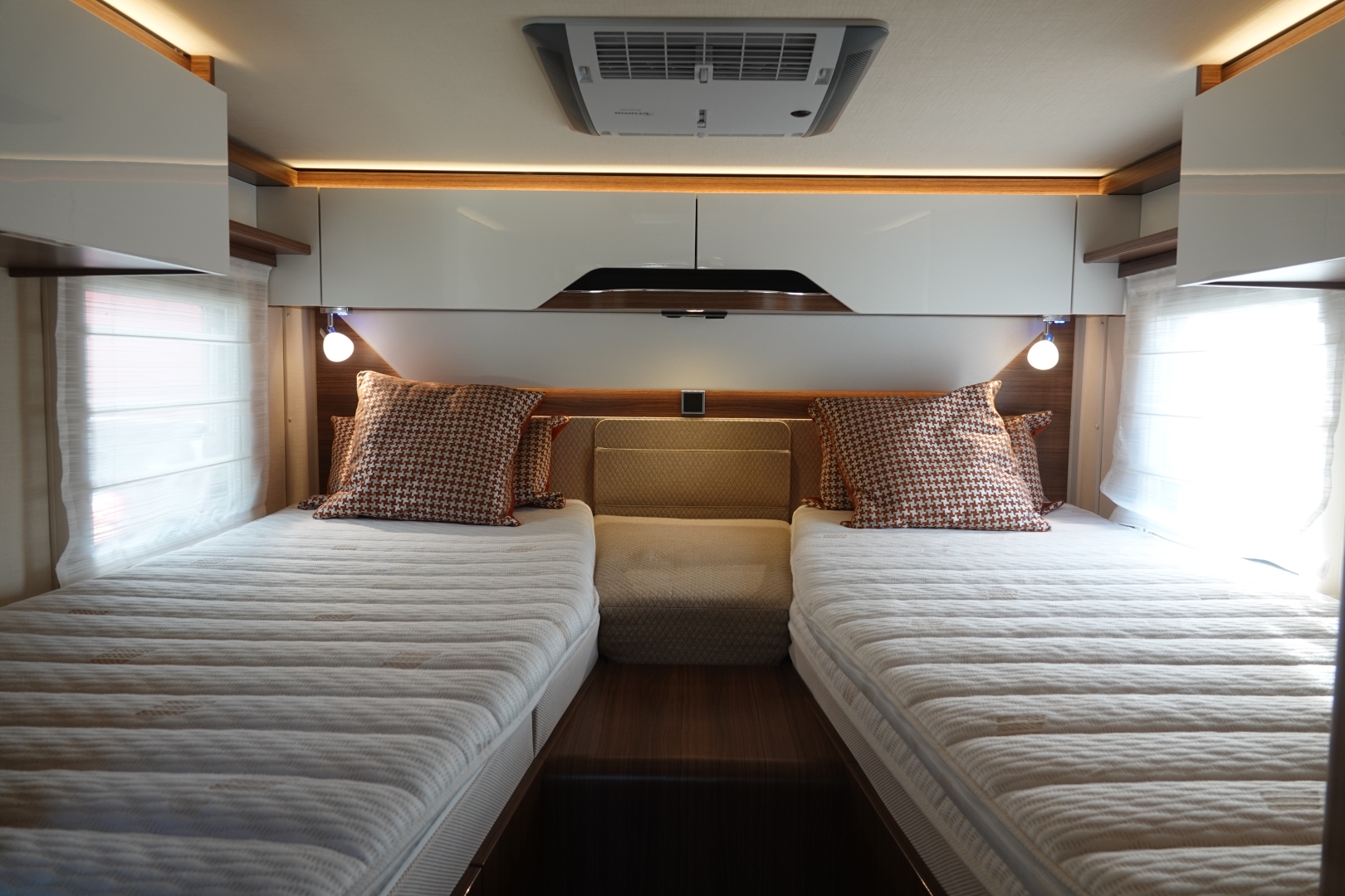Het slaapgedeelte achterin heeft 2 lengte bedden met traagschuim matras op schotelsysteem voor optimaal slaapcomfort.