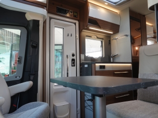 Het interieur decor bestaat uit het Hymer Noce Cognac meubilair met de luxe Creola bekleding met lederinleg wat in combinatie met de vele LED verlichting een bijzondere sfeer geeft.