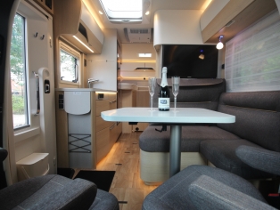 Het interieur bestaat uit het Hymer Grand Oak decor met de luxe Janeiro stofbekleding wat in combinatie met de vele LED verlichting een bijzondere sfeer geeft. Het interieur is heerlijk koel te houden dmv. Truma dakairco.