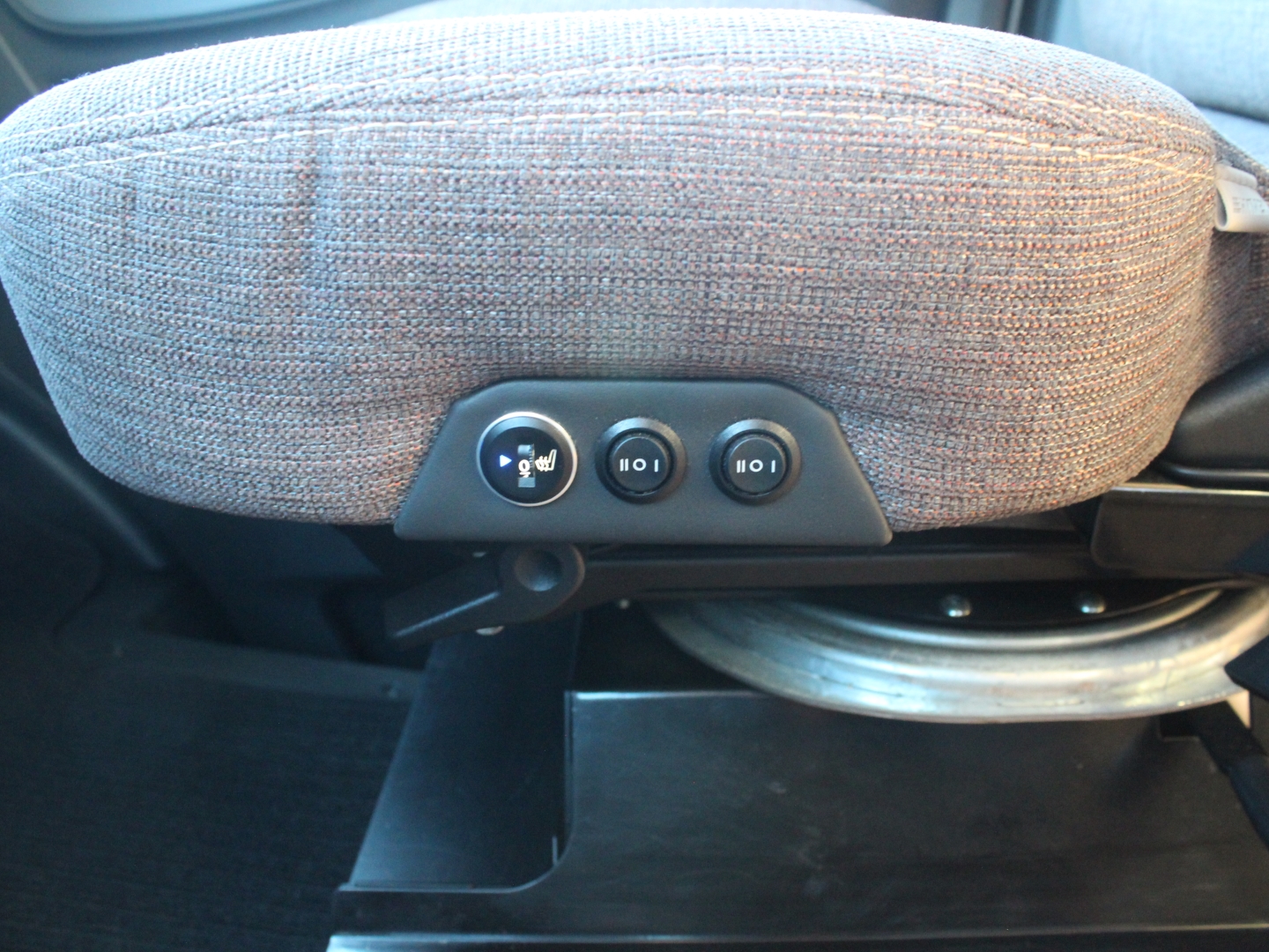 2 comfortabele pilotestoelen in hoogte verstelbaar, met stoelverwarming en lendensteunen, draaibaar naar een gezellige zitgroep met luxe salontafel en groot panoramadak er boven.