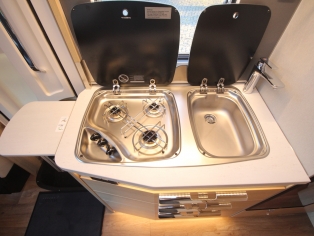 De royale keuken heeft een luxe keukenblad met spoelbak en 3 pits kooktoestel met automatische ontsteking, diverse lades met servosoft sluiting en verrassend veel bergruimte voor het kookgerei en boodschappen, grote Smart Tower koelkast met vriezer, en automatische energiekeuze.