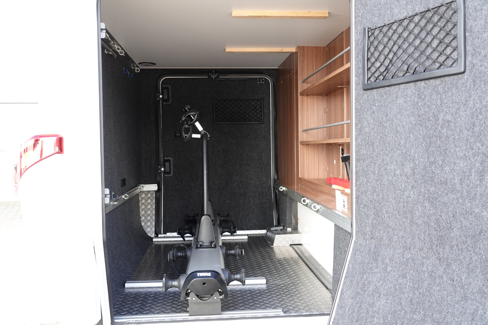 De bijzonder royale garage is bereikbaar via een grote deur links en rechts, en biedt voldoende ruimte voor het binnen stallen van uw fietsen ( 132 cm vrije laadhoogte) en andere bagage. De fietsen zijn eenvoudig te plaatsen op de Thule Veloslide uitschuifbare fietsendrager.