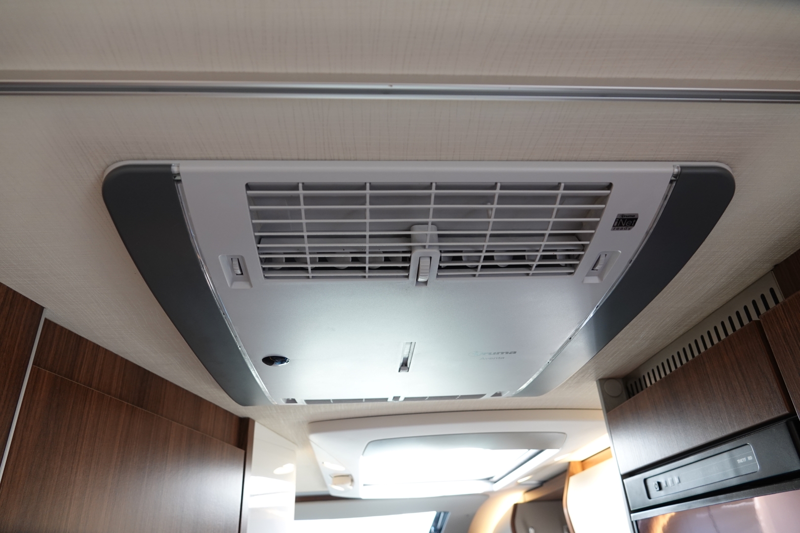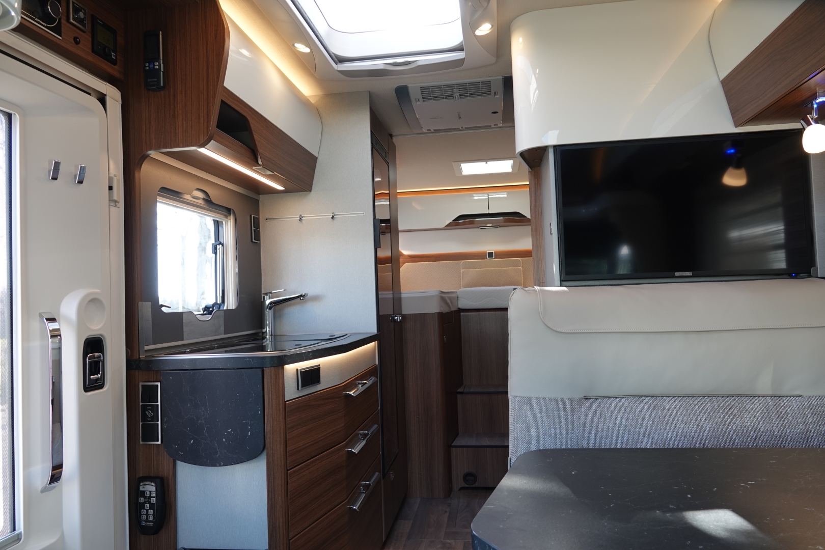 Het interieur bestaat uit het Hymer Noce cognac decor met de luxe Creola stofbekleding met lederinleg wat in combinatie met de vele LED verlichting een bijzondere sfeer geeft. Het interieur is heerlijk koel te houden dmv. Truma Aventa dakairco.