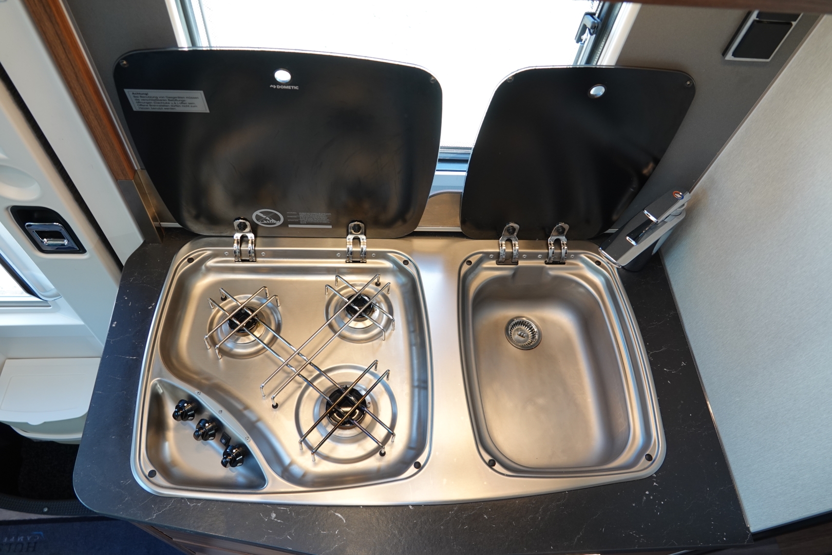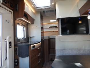 De royale keuken heeft een luxe keukenblad met spoelbak en 3 pits kooktoestel met automatische ontsteking, diverse lades met servosoft sluiting en verrassend veel bergruimte voor het kookgerei en boodschappen, grote Smart Tower koelkast met vriezer, en automatische energiekeuze.