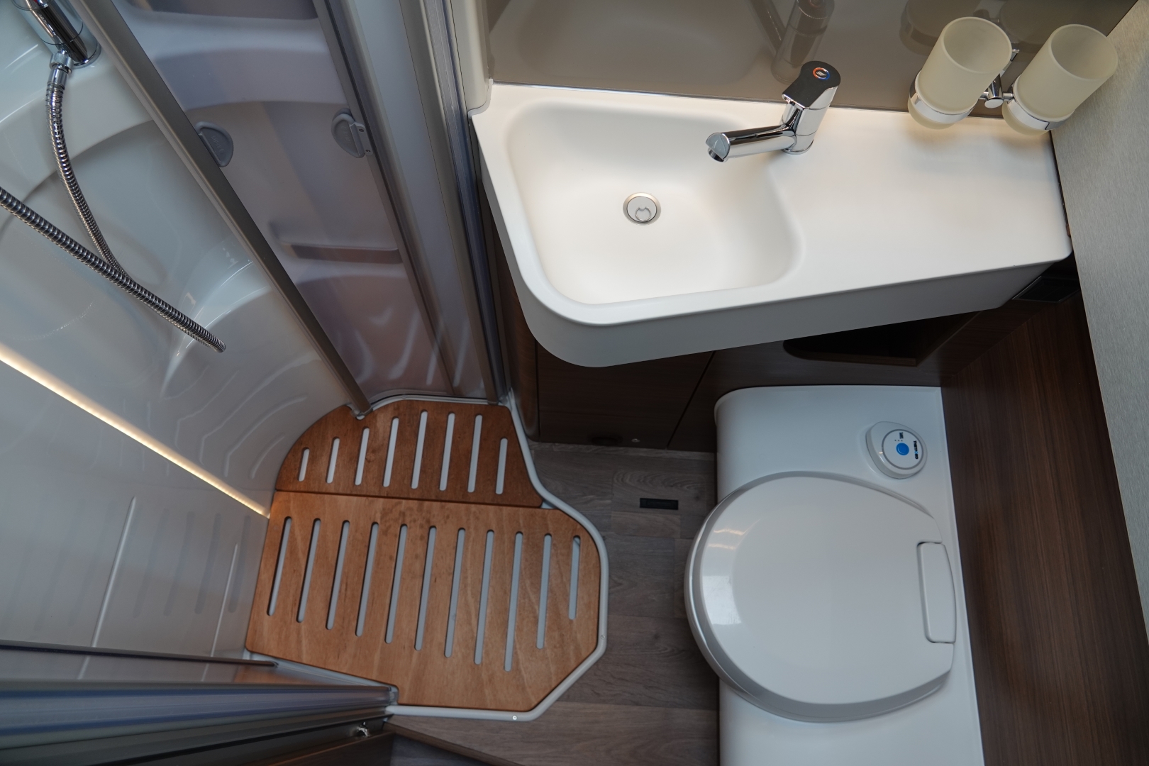 De ruime badkamer met wastafel heeft een Thetford toilet met extra kastruimte en een aparte grote douchecabine met houten vlonder.