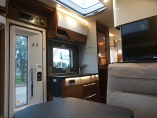 Het interieur bestaat uit het Hymer Noce Cognac meubilair met de luxe Tortora leer bekleding wat in combinatie met de vele LED verlichting een bijzondere sfeer geeft.