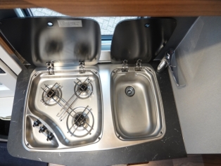 De royale keuken heeft een luxe keukenblad met spoelbak en 3 pits kooktoestel met automatische ontsteking, diverse gelagerde laden met verrassend veel bergruimte voor het kookgerei en boodschappen, grote Smart Tower koelkast met vriezer, en automatische energiekeuze.