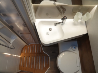 De ruime badkamer met wastafel heeft een Thetford toilet met extra kastruimte en een aparte grote douchecabine.