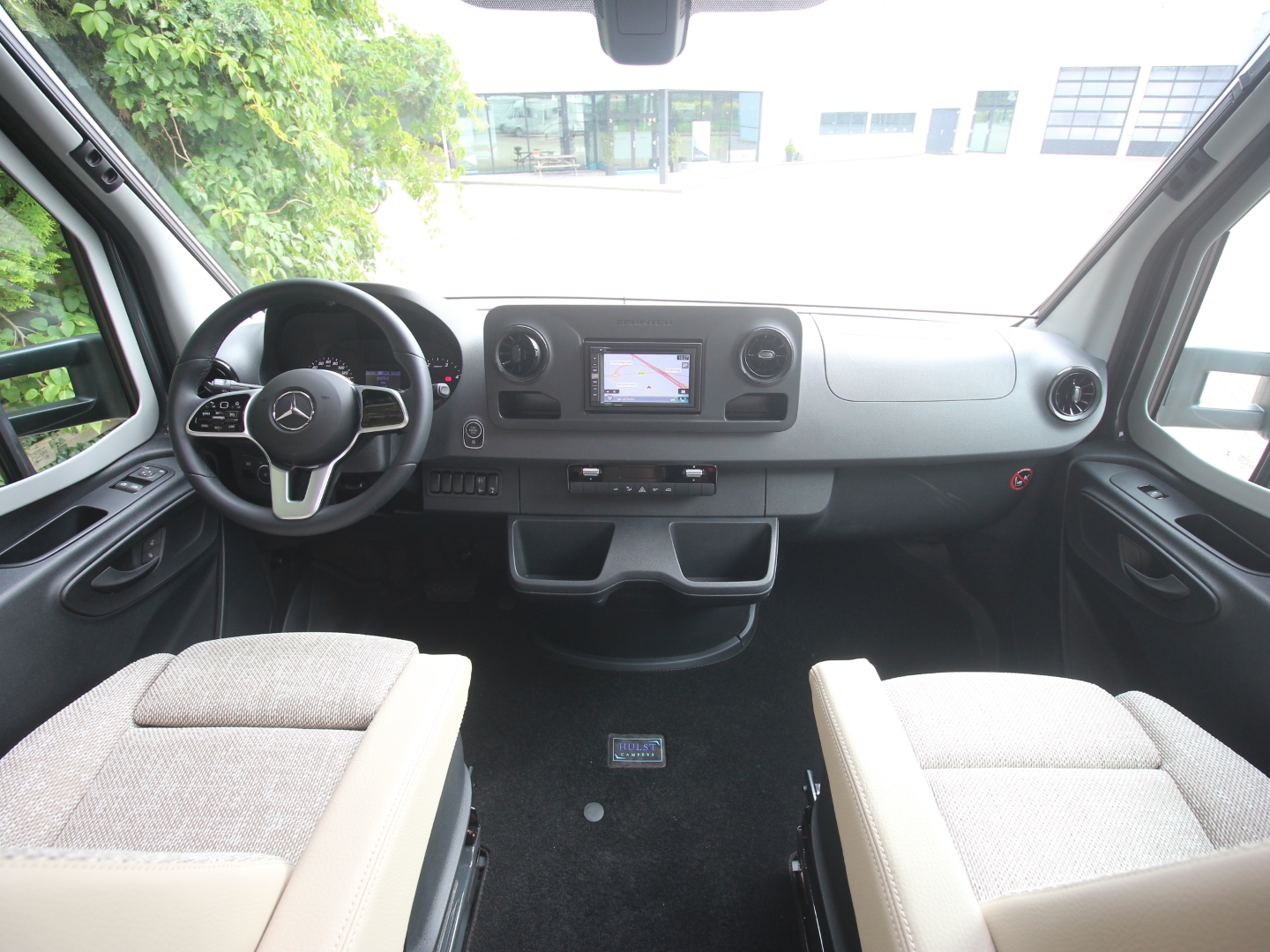 2 comfortabele pilotestoelen in hoogte verstelbaar, draaibaar naar een gezellige zitgroep met luxe salontafel en groot panoramadak er boven.