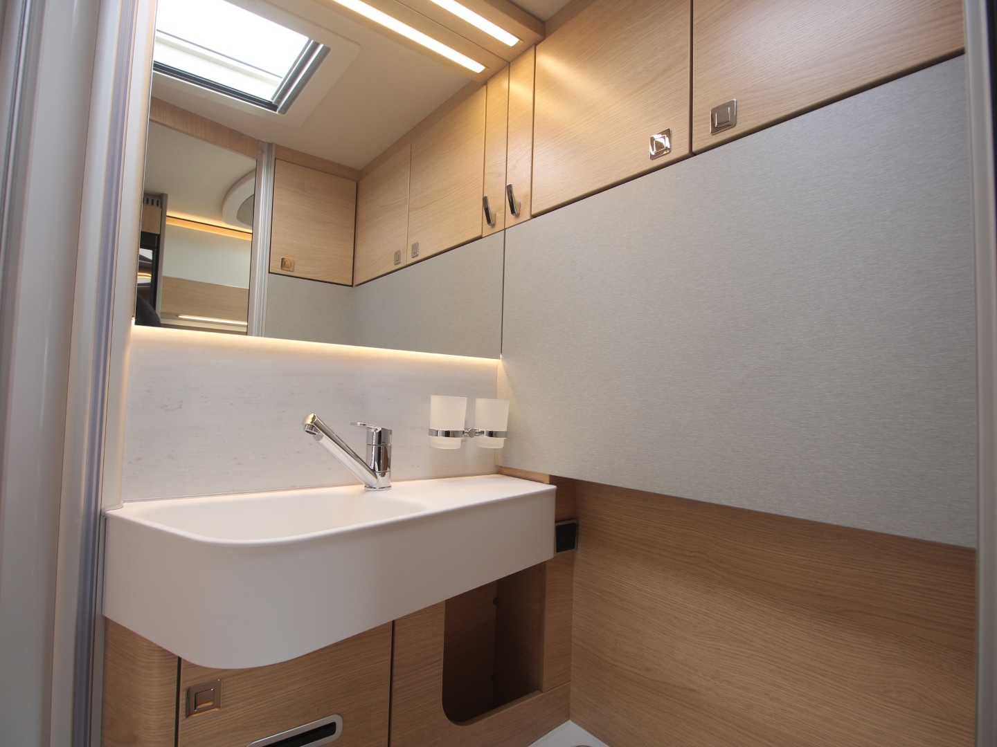 Het interieur bestaat uit het Hymer Grand Oak meubilair met de luxe Creola stofbekleding met lederinleg wat in combinatie met de vele LED verlichting een bijzondere sfeer geeft.