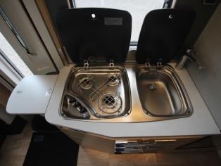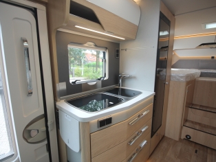 De royale keuken heeft een luxe keukenblad met spoelbak en 3 pits kooktoestel met automatische ontsteking, diverse gelagerde laden met verrassend veel bergruimte voor het kookgerei en boodschappen, grote Smart Tower koelkast met vriezer, en automatische energiekeuze.