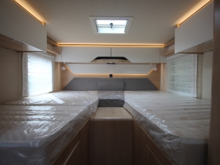 Het slaapgedeelte achterin heeft 2 enkele bedden met traagschuim matras op schotellatten bodem voor optimaal slaapcomfort, van de zitgroep is eventueel een 3e slaapplaats te maken.