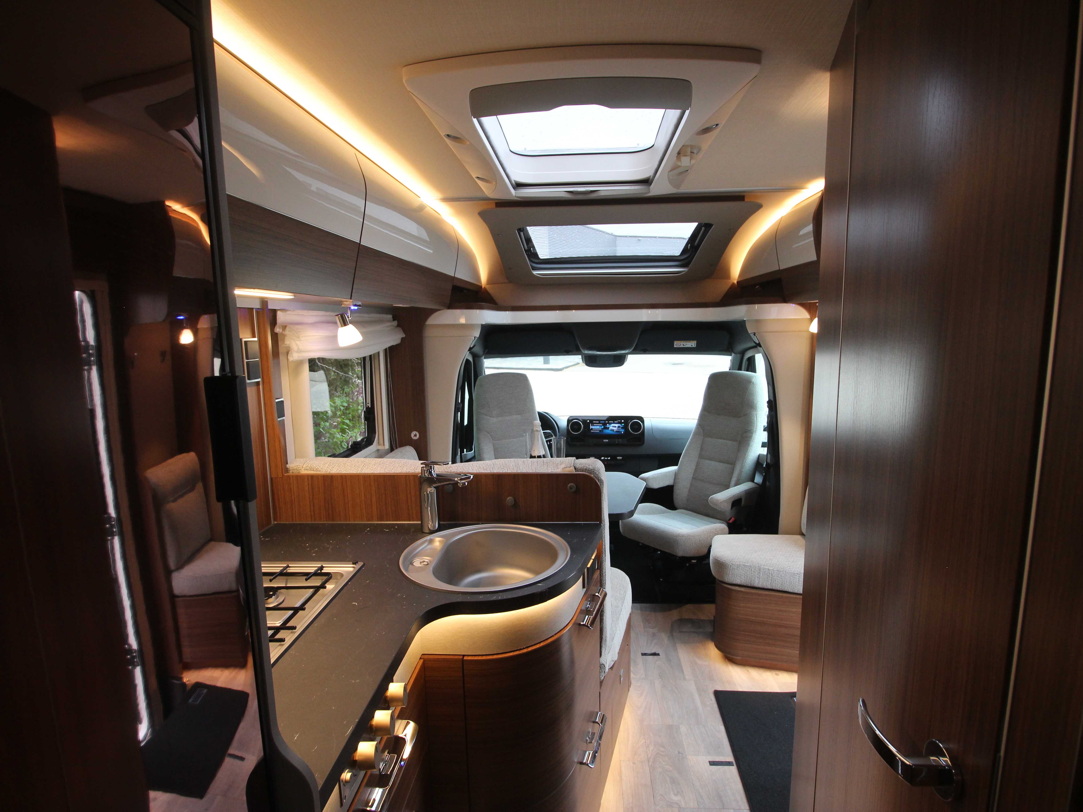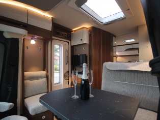 2 comfortabele pilotestoelen in hoogte verstelbaar, draaibaar naar een gezellige zitgroep met luxe salontafel en groot panoramadak er boven.