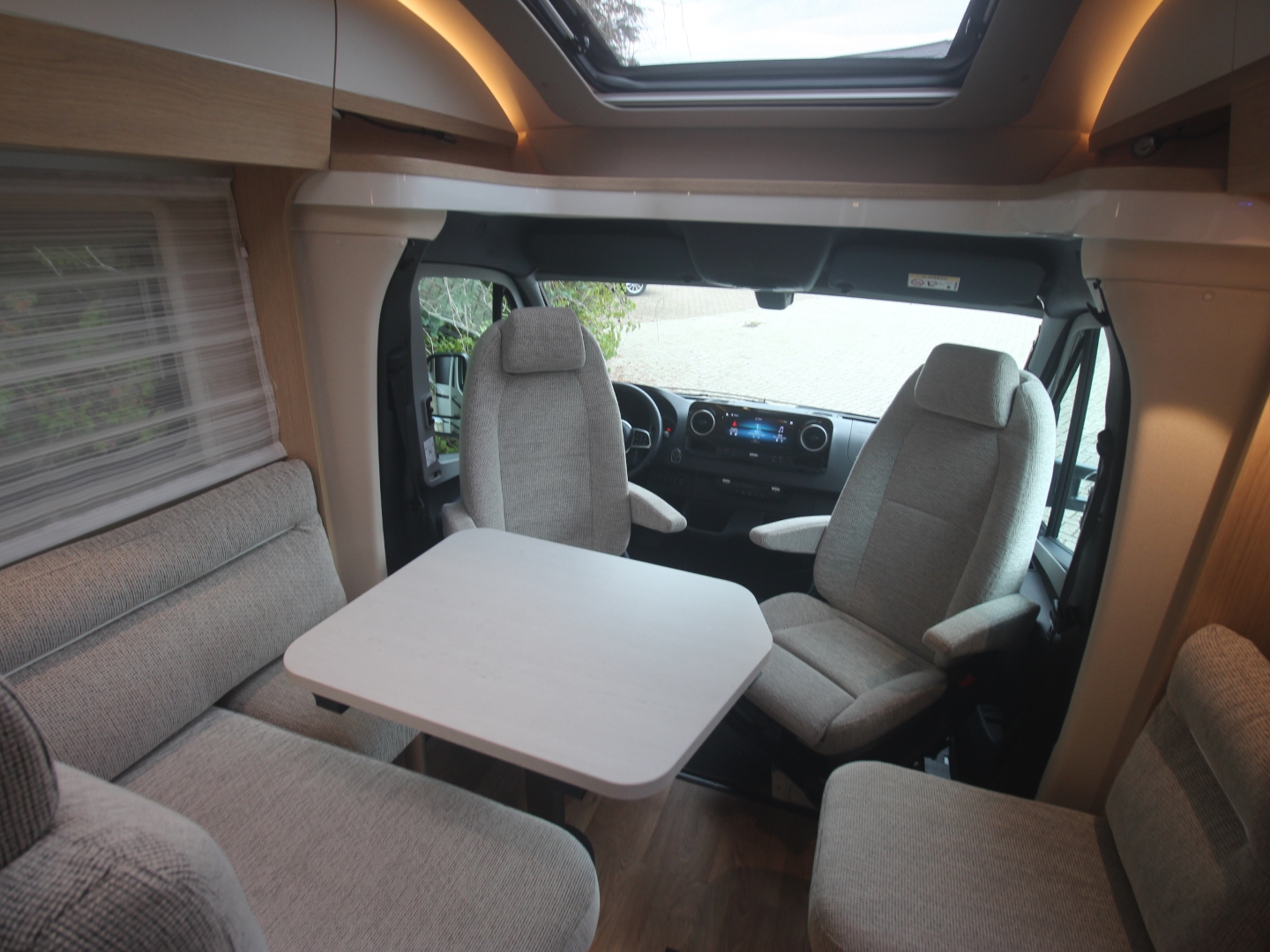2 comfortabele pilotestoelen in hoogte verstelbaar, draaibaar naar een gezellige zitgroep met luxe salontafel en groot panoramadak er boven.