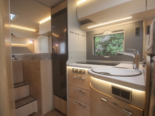 De royale keuken heeft een luxe keukenblad met spoelbak en 3 pits kooktoestel met automatische ontsteking, diverse lades met servosoft sluiting en verrassend veel bergruimte voor het kookgerei en boodschappen, grote Smart Tower koelkast met vriezer, en automatische energiekeuze.