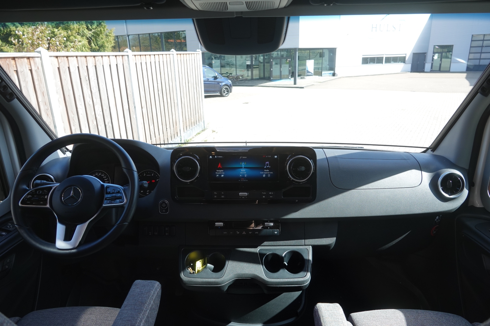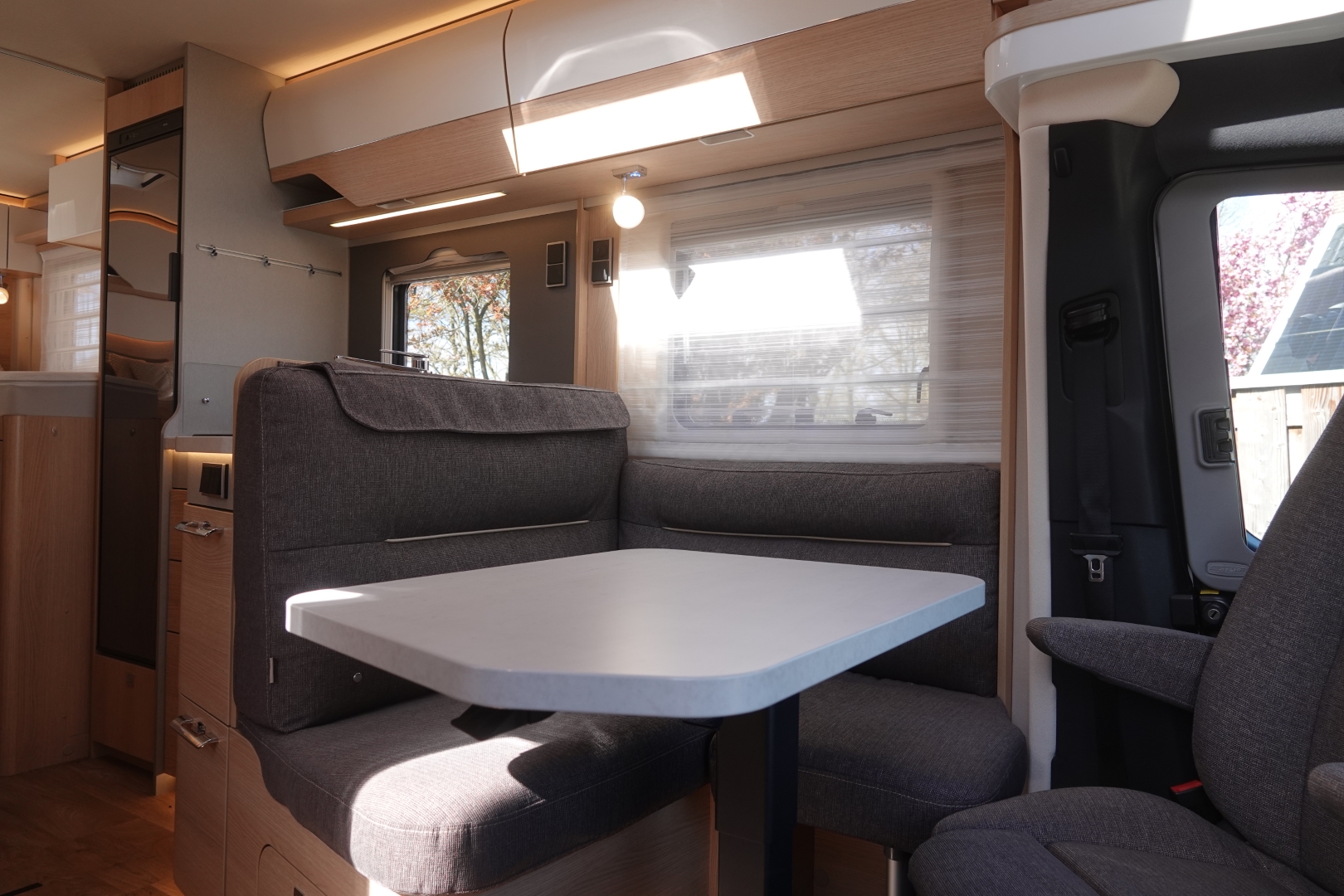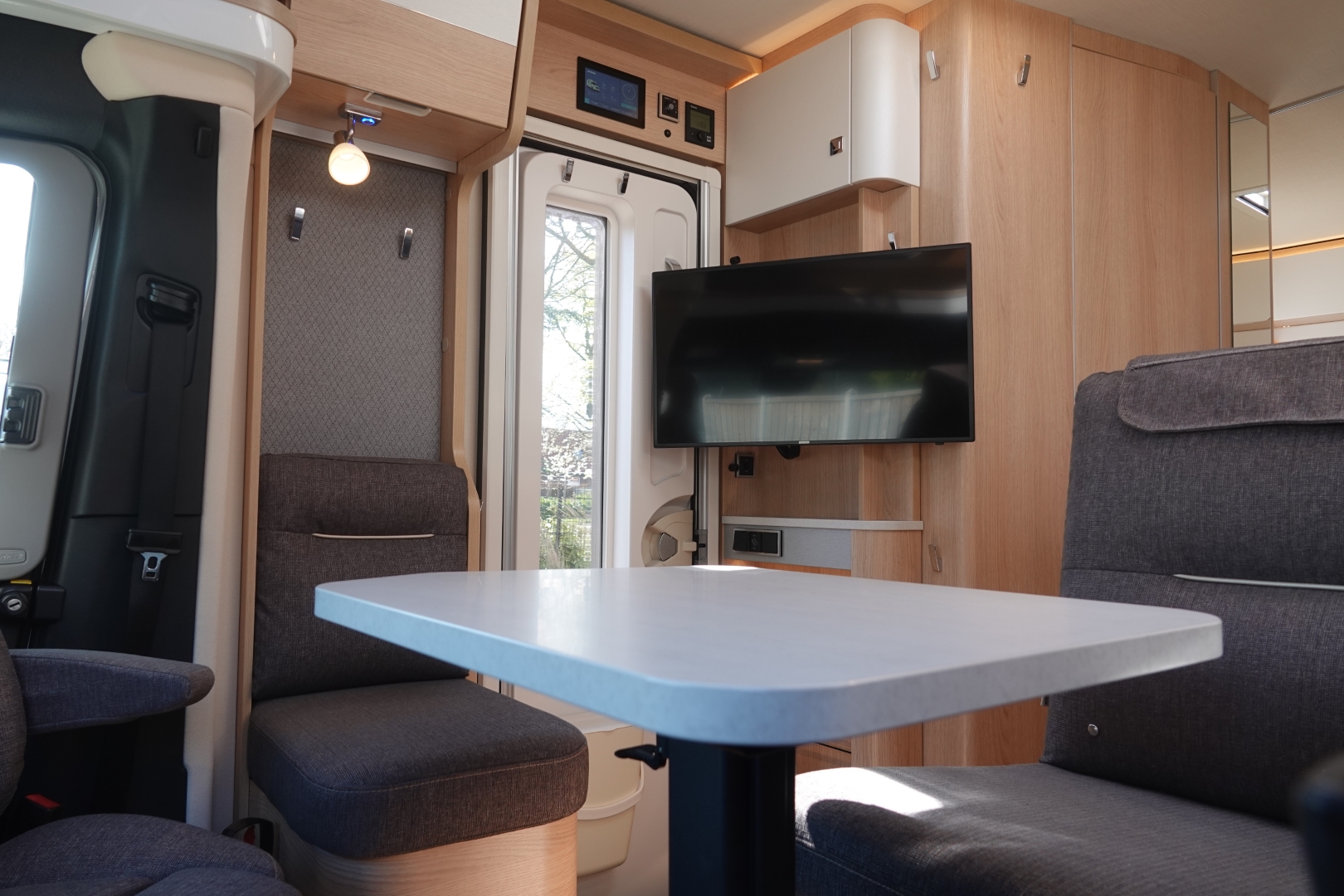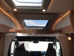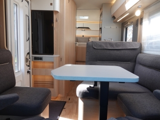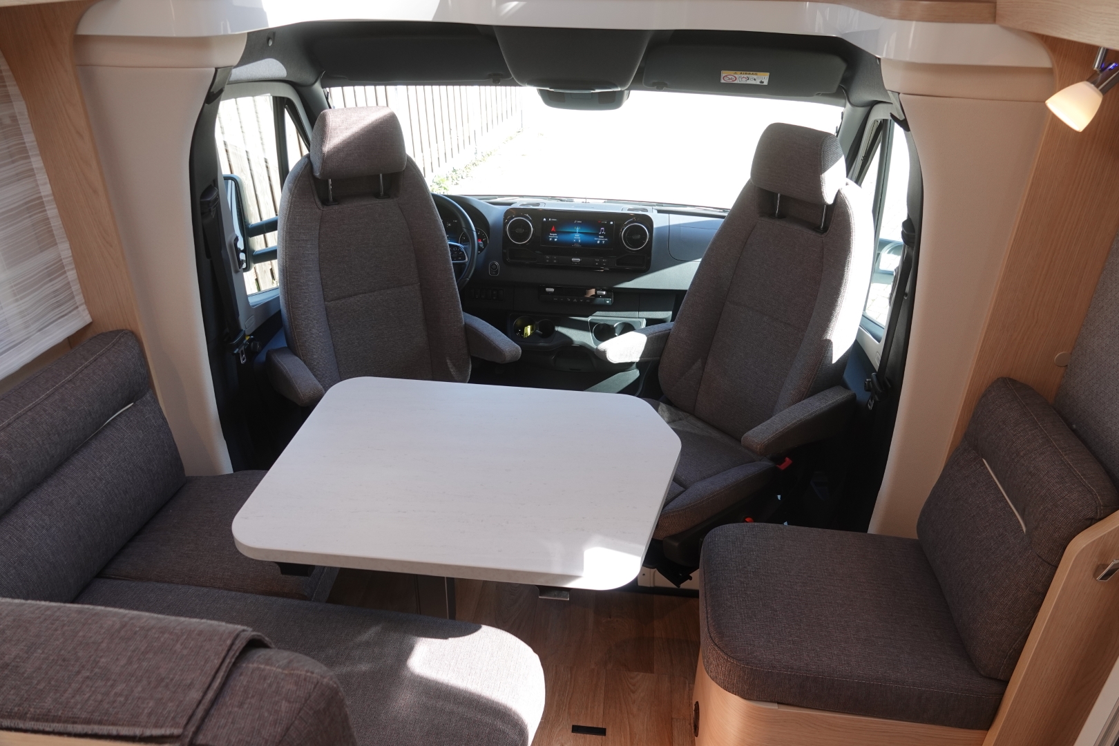 2 comfortabele pilotestoelen in hoogte verstelbaar, draaibaar naar een gezellige zitgroep met luxe salontafel en groot panoramadak er boven.