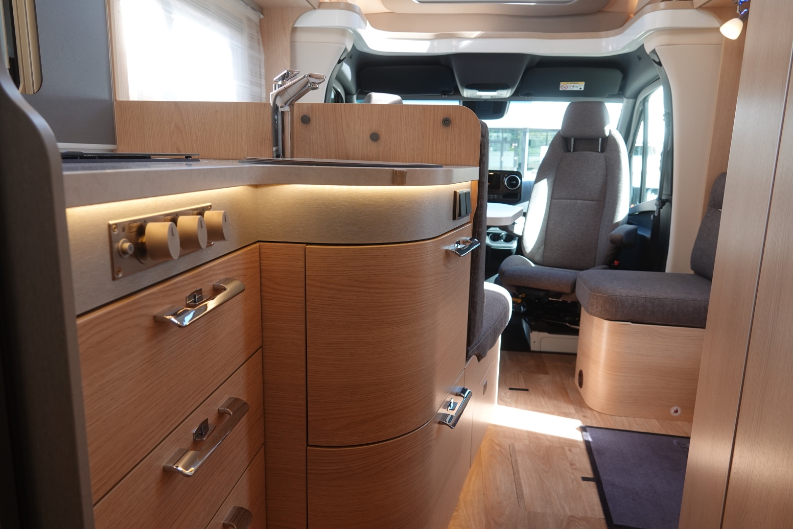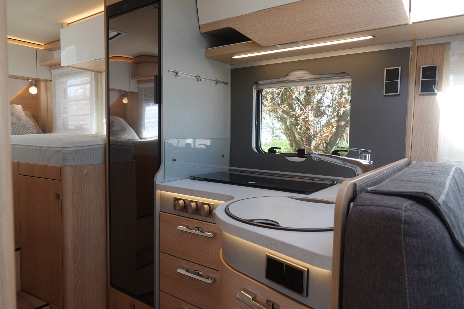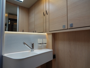 Het interieur bestaat uit het Hymer Grand Oak decor met de luxe Colombo stofbekleding wat in combinatie met de vele LED verlichting een bijzondere sfeer geeft.