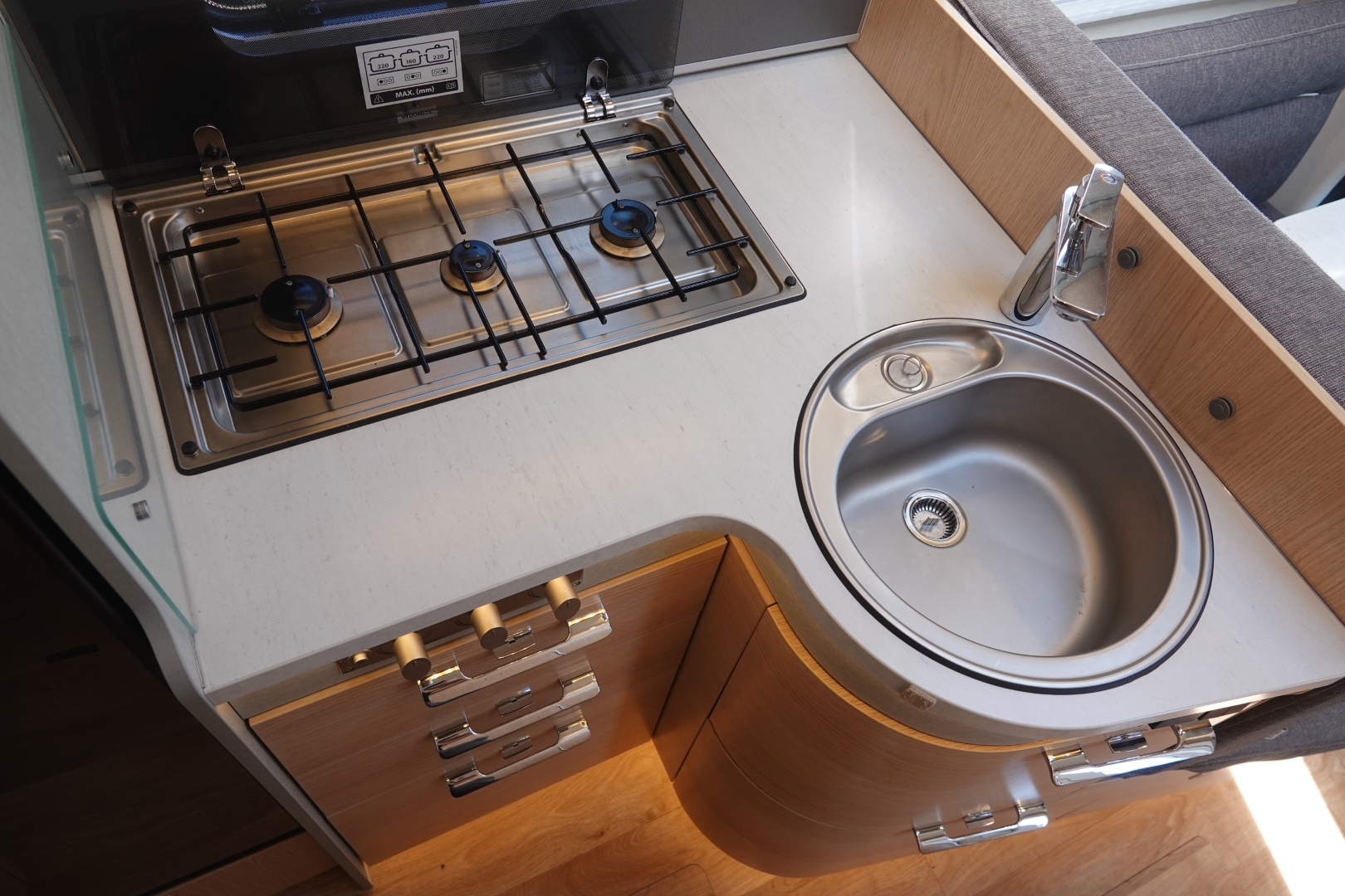 De royale hoekkeuken heeft een luxe keukenblad met spoelbak en 3 pits kooktoestel met automatische ontsteking, diverse lades met softclose sluiting en verrassend veel bergruimte voor het kookgerei en boodschappen, grote Smart Tower koelkast met vriezer, en automatische energiekeuze.