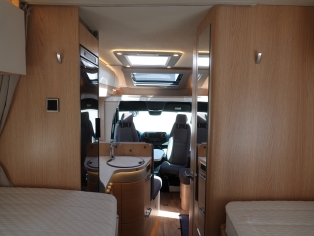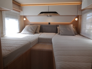 Het slaapgedeelte achterin heeft 2 enkele bedden (dicht te leggen tot eén groot bed) met traagschuim matras voor optimaal slaapcomfort. Van de zitgroep is tevens een extra slaapplaats te maken.