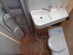 De ruime badkamer met wastafel heeft een Thetford toilet met SOG toiletontluchting, extra kastruimte en een aparte grote douchecabine.