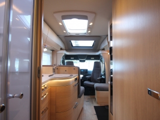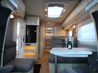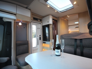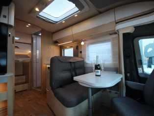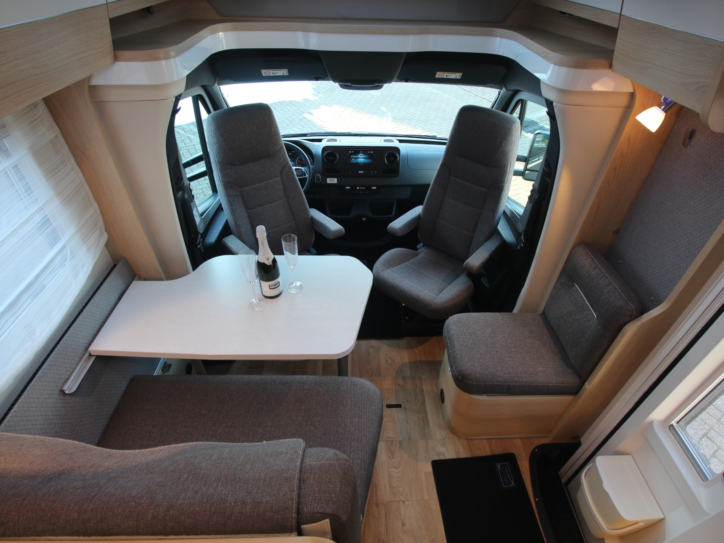 2 comfortabele pilotestoelen kantelbaar en in hoogte verstelbaar, draaibaar naar een gezellige zitgroep met luxe salontafel en groot panoramadak er boven.