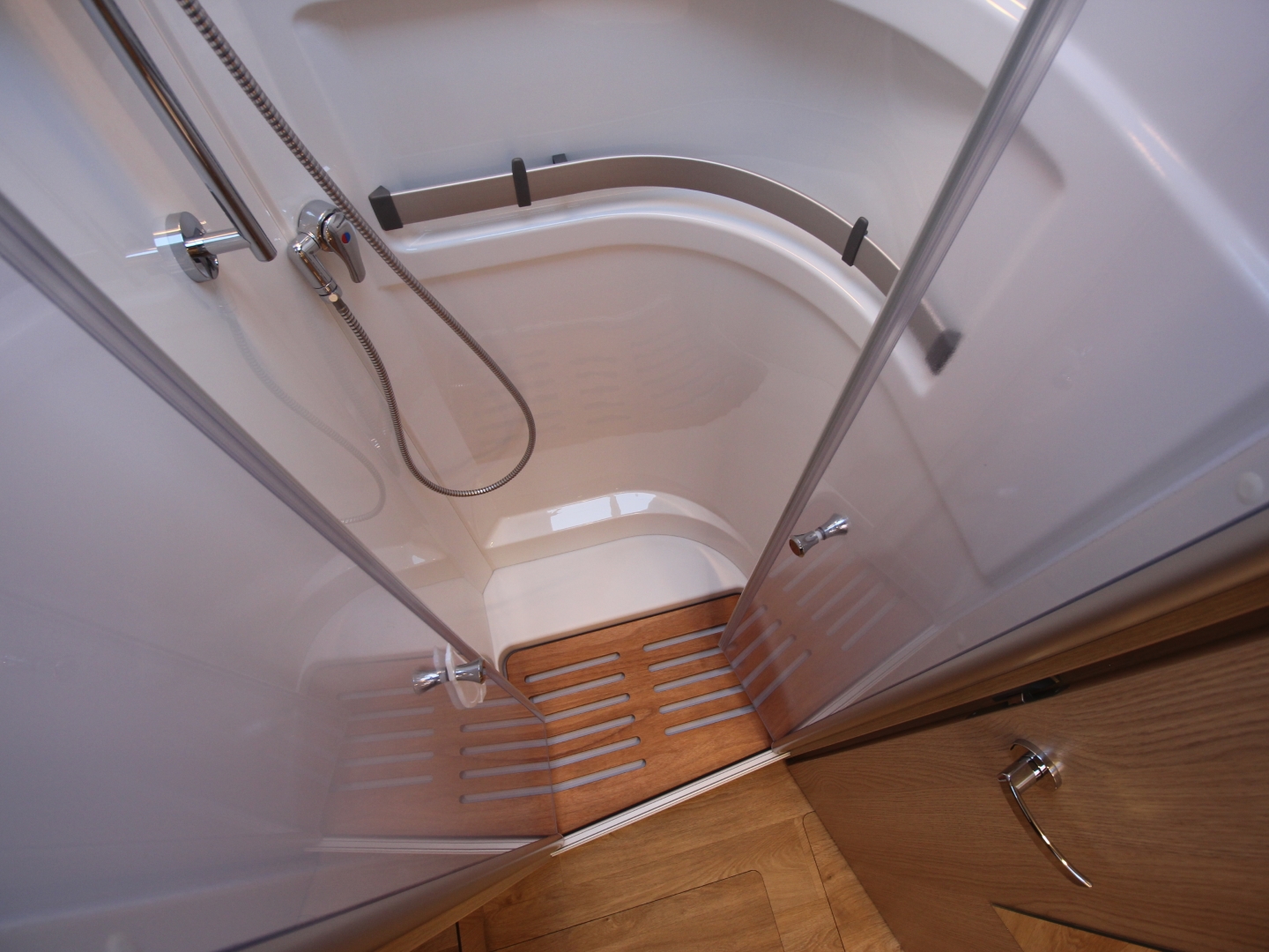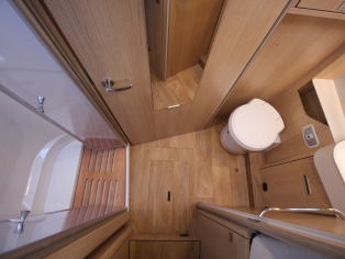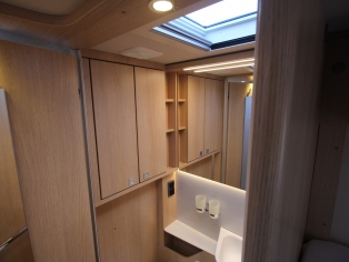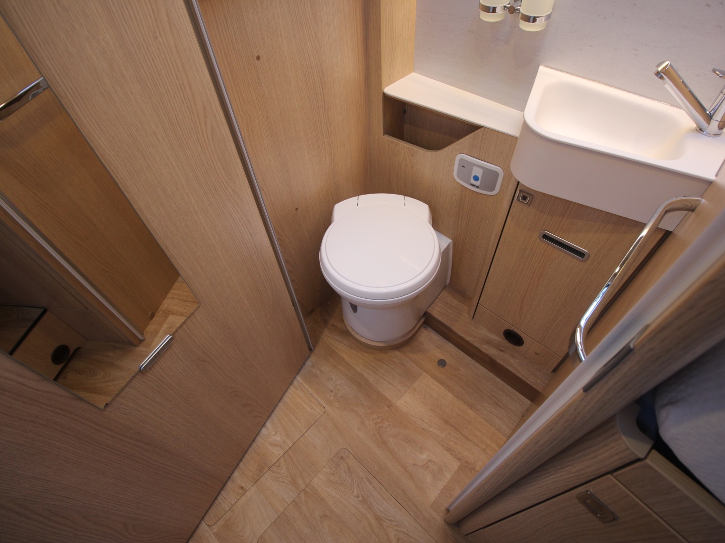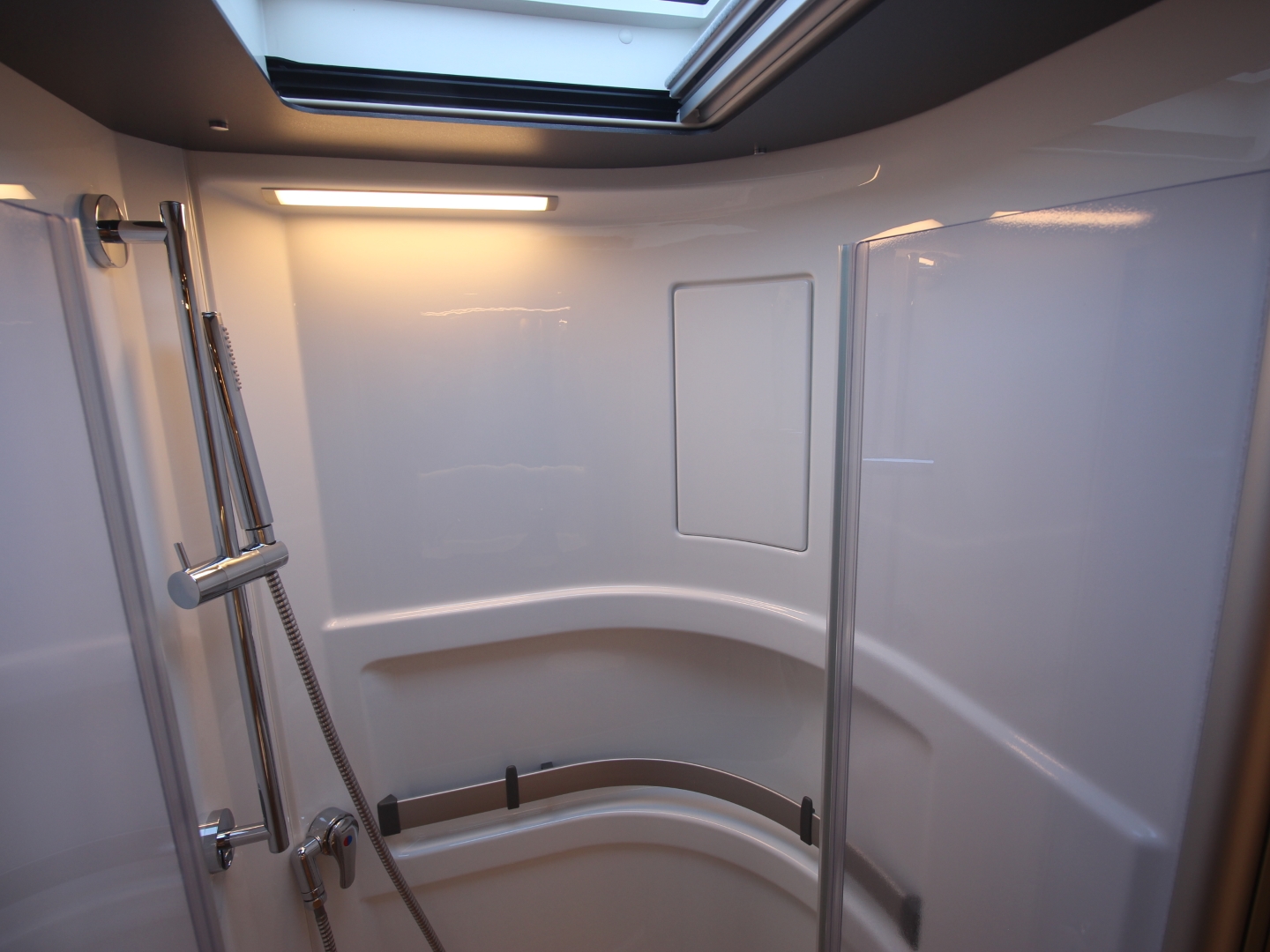 De ruime badkamer met wastafel heeft een Thetford toilet met SOG en extra kastruimte, en ertegenover een grote douchecabine.