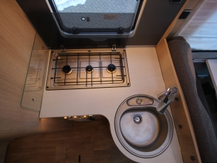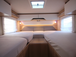 Het slaapgedeelte achterin heeft 2 enkele bedden (dicht te leggen tot 1 groot bed) met traagschuim matras op schotelsysteem voor optimaal slaapcomfort.