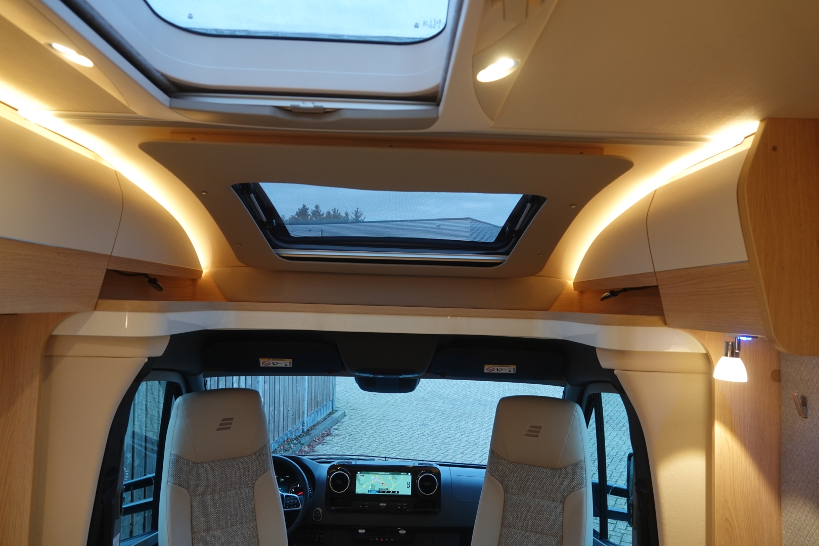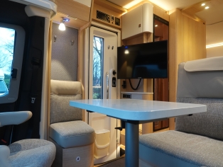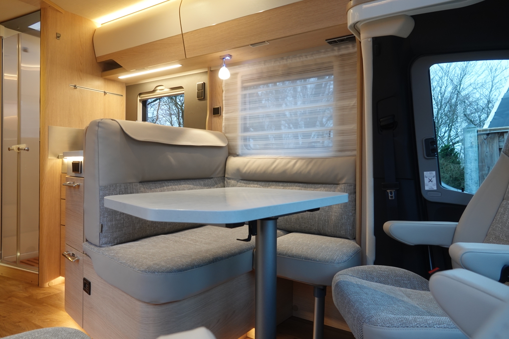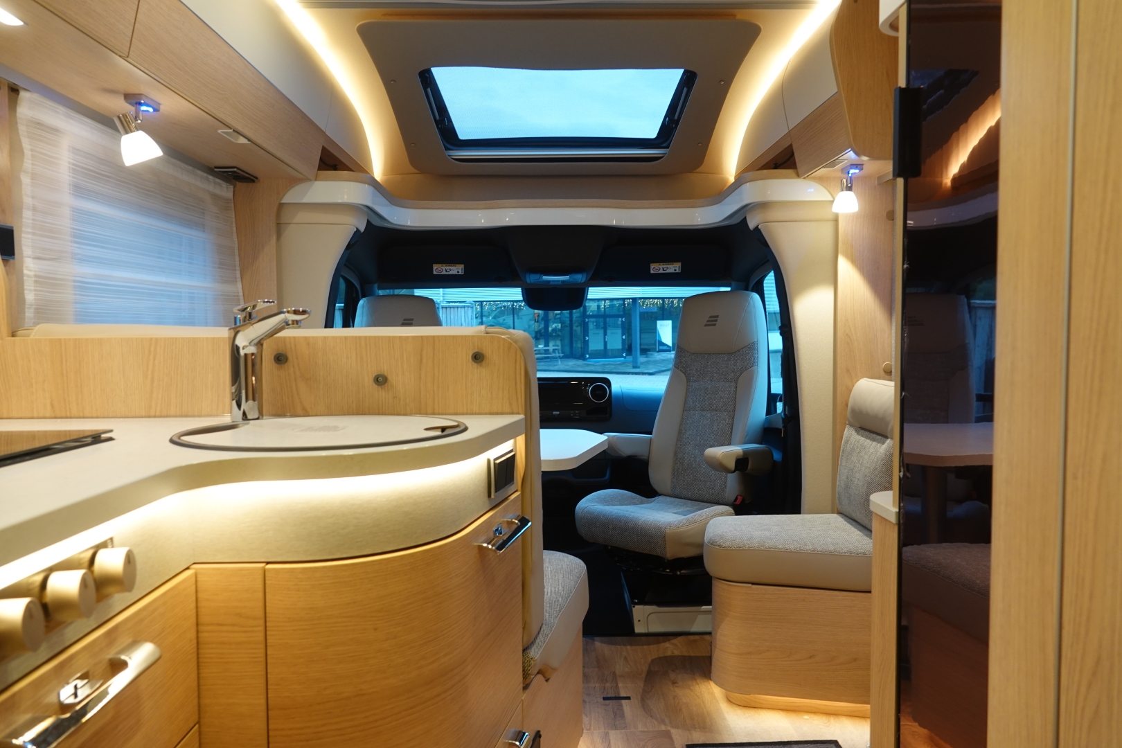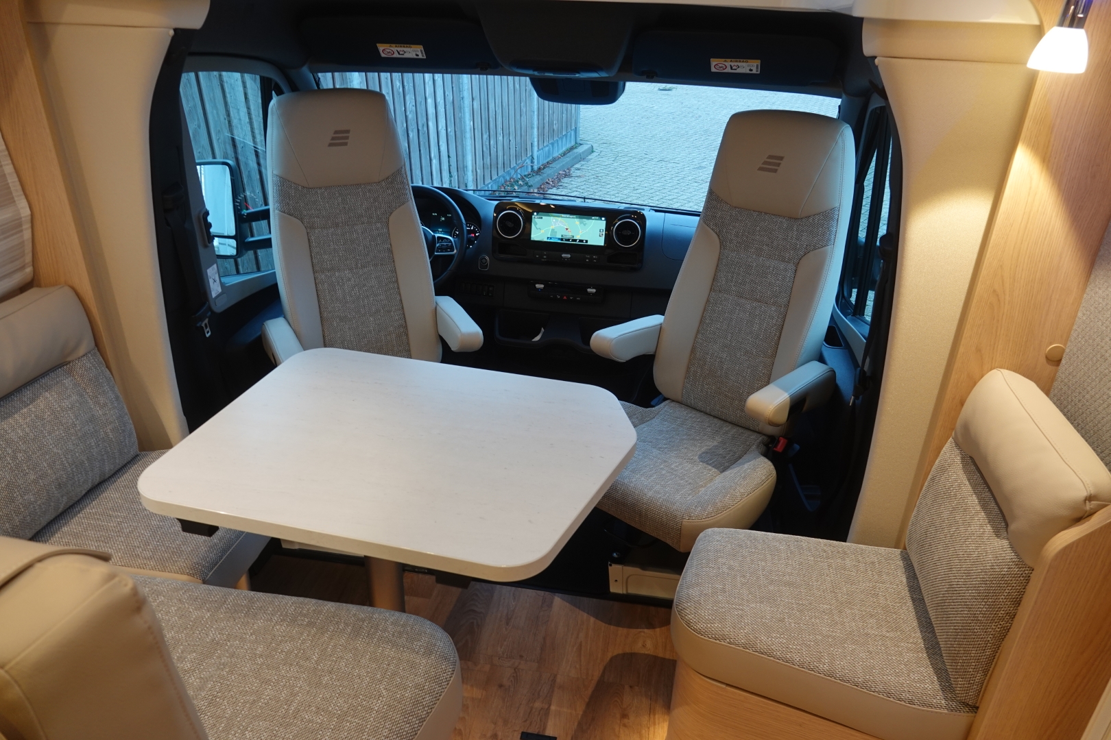 2 comfortabele pilotestoelen kantelbaar en in hoogte verstelbaar, draaibaar naar een gezellige zitgroep met luxe salontafel en groot panoramadak er boven.