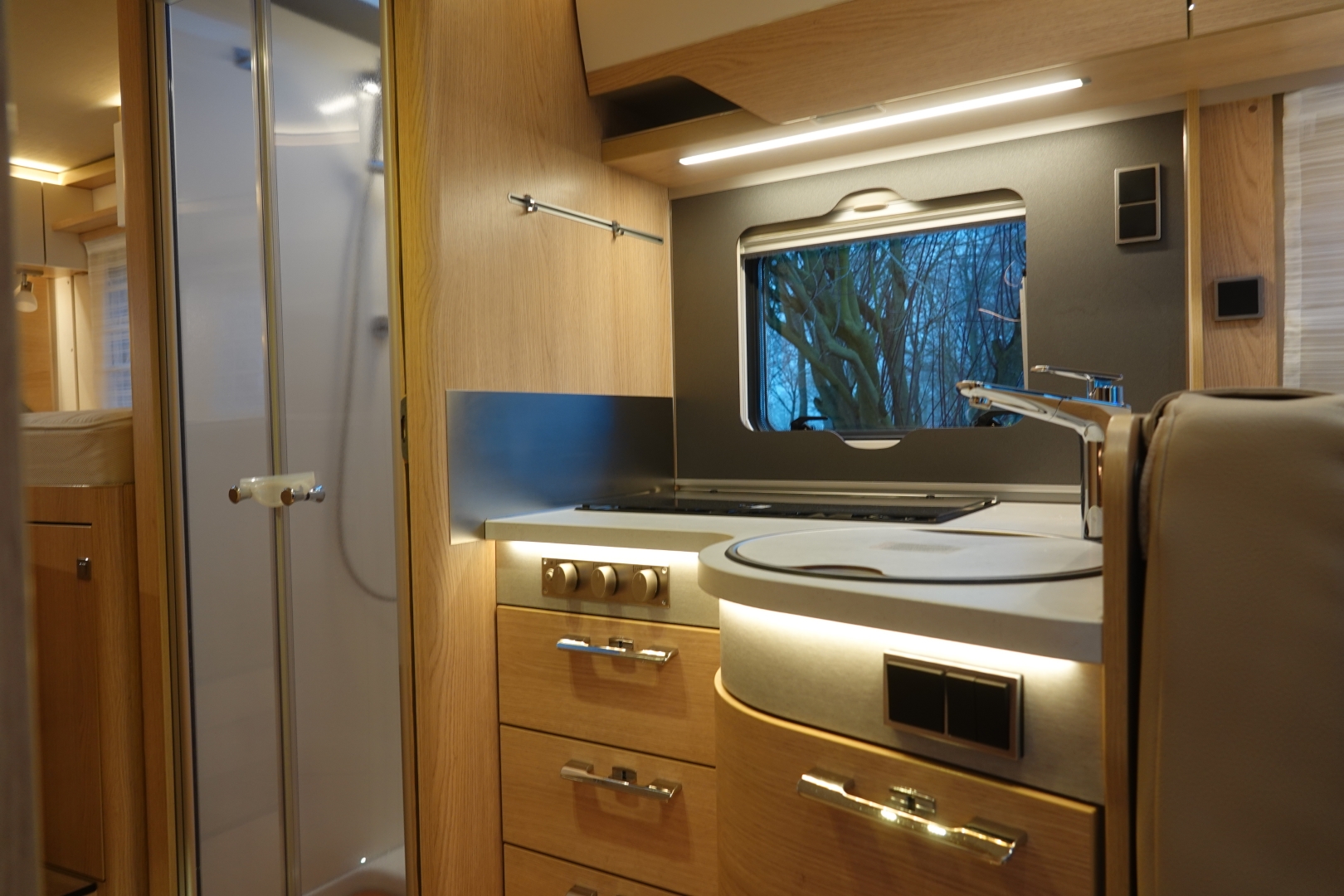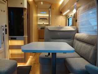 Het interieur bestaat uit het Hymer Grand Oak meubeldecor met de luxe Creola stofbekleding met lederinleg wat in combinatie met de vele LED verlichting een bijzondere sfeer geeft.