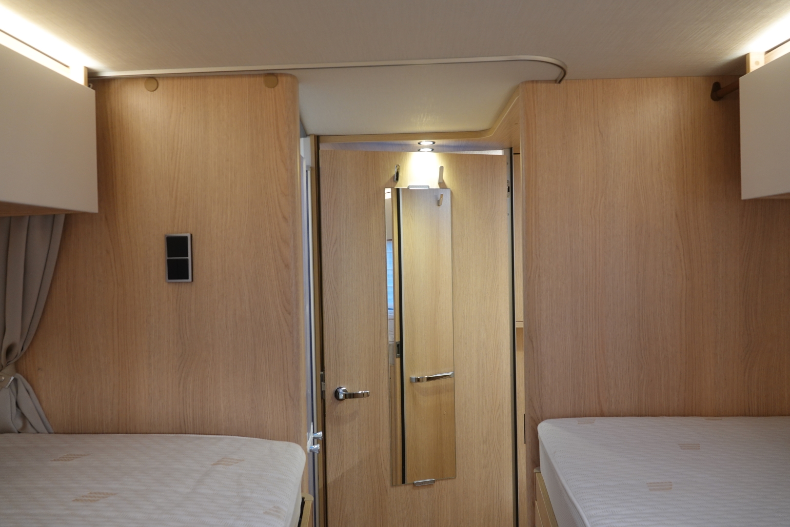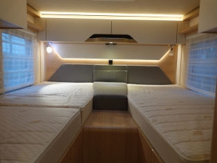 Het slaapgedeelte achterin heeft 2 enkele bedden met traagschuim matras op schotelsysyteem voor optimaal slaapcomfort.