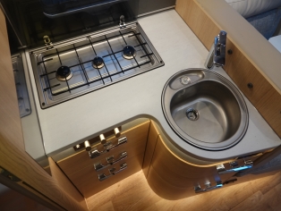 De royale hoekkeuken heeft een luxe keukenblad met spoelbak en 3 pits kooktoestel met automatische ontsteking, diverse gelagerde laden met verrassend veel bergruimte voor het kookgerei en boodschappen, grote Smart Tower koelkast met vriezer, en automatische energiekeuze.