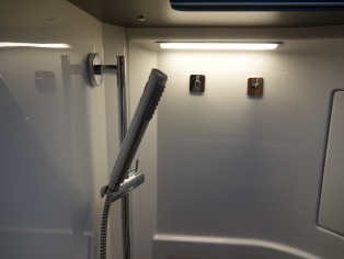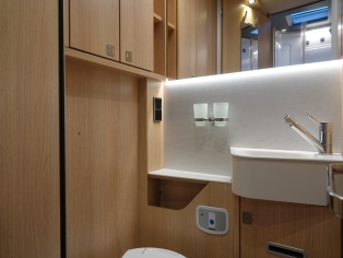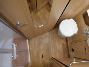 De ruime badkamer met wastafel heeft een Thetford toilet en extra kastruimte, en er tegenover een separate ruime douchecabine. Door de tussendeur te sluiten ontstaat er een royale slaapkamer met sanitaire ruimte.