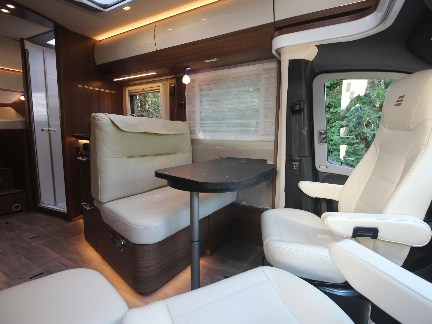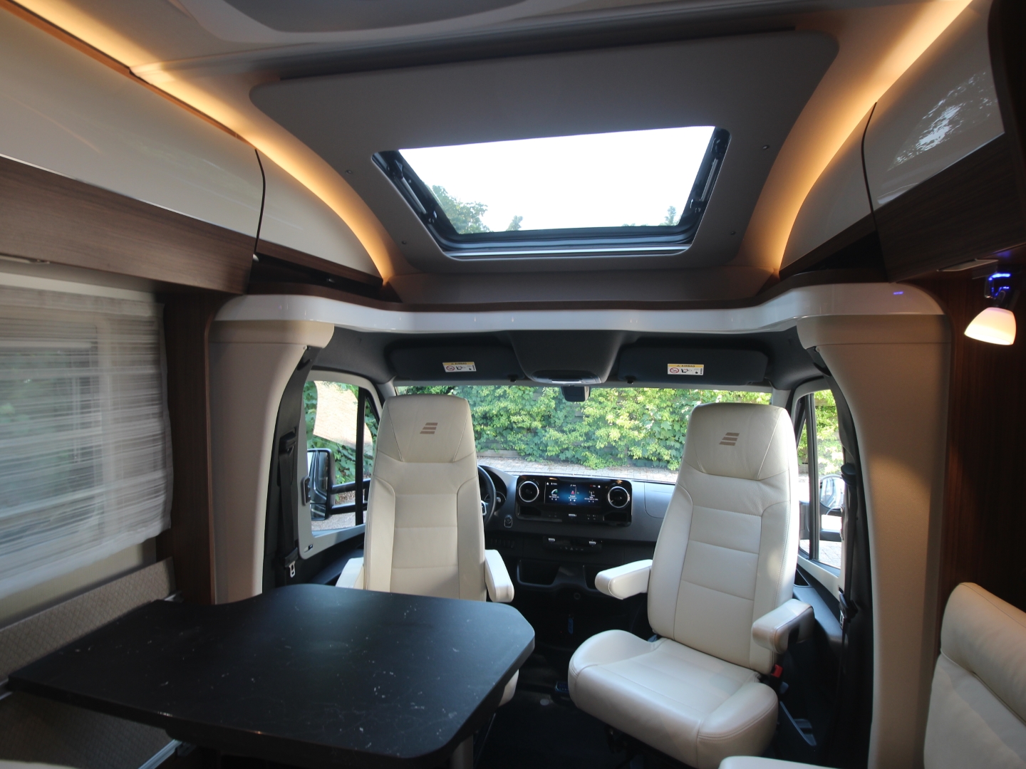 2 comfortabele pilotestoelen kantelbaar en in hoogte verstelbaar, draaibaar naar een gezellige zitgroep met luxe salontafel en groot panoramadak er boven.