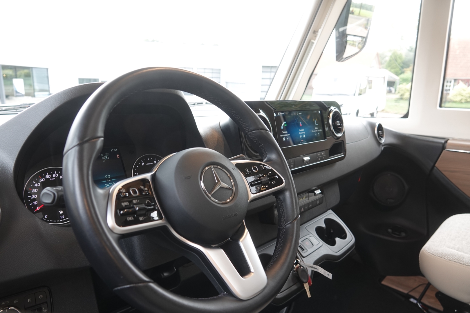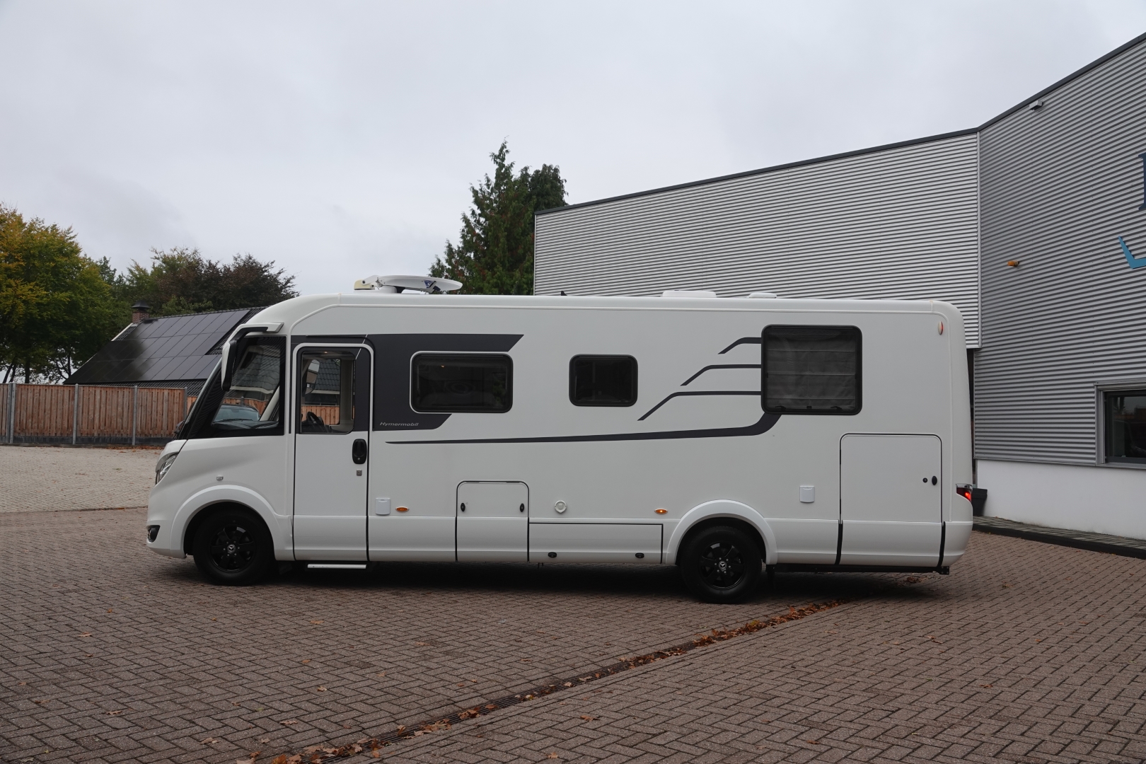 Deze prachtige Hymer B-Klasse Master Line I 790 uit het topsegment is voorzien van talrijke unieke innovaties en maakt daardoor het mobiele reizen nog comfortabeler, hoogwaardiger, veiliger en relaxter. Uitgevoerd met de nieuwste Mercedes Benz 418 CDI 177 PK Euro 6c motor met de 9G-Tronic automaat incl. Hold functie. Dankzij het innovatieve SLC Chassis is comfortabel rijgedrag en stabiele wegligging gegarandeerd. Het is een on-afhankelijk torsie geveerd breedspoor met laag zwaartepunt, techniekvakken, verwarmde vlakke bodem en doorlaadmogelijkheid. Het lederen stuurwiel met bediening voor de MBUX 10 DAB multimediasysteem geeft een fantastisch gebruikersgemak van o.a. het navigatiesysteem, achteruitrijcamera, dmv. touchscreen. Tevens voorzien van lichtmetalen velgen met 4 seizoenenbanden, mistlampen met kader, grille in chrome, GFK dak, ESP, adaptive cruisecontrol, actieve remassistent, elektrische parkeerrem, automatische airco, centrale vergrendeling, bestuurders en bijrijdersairbag, en elektrisch bedienbare spiegels en ramen.