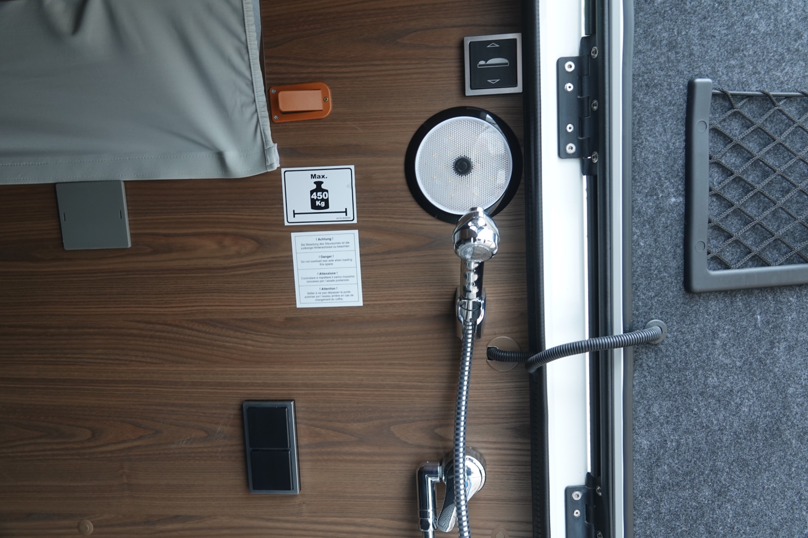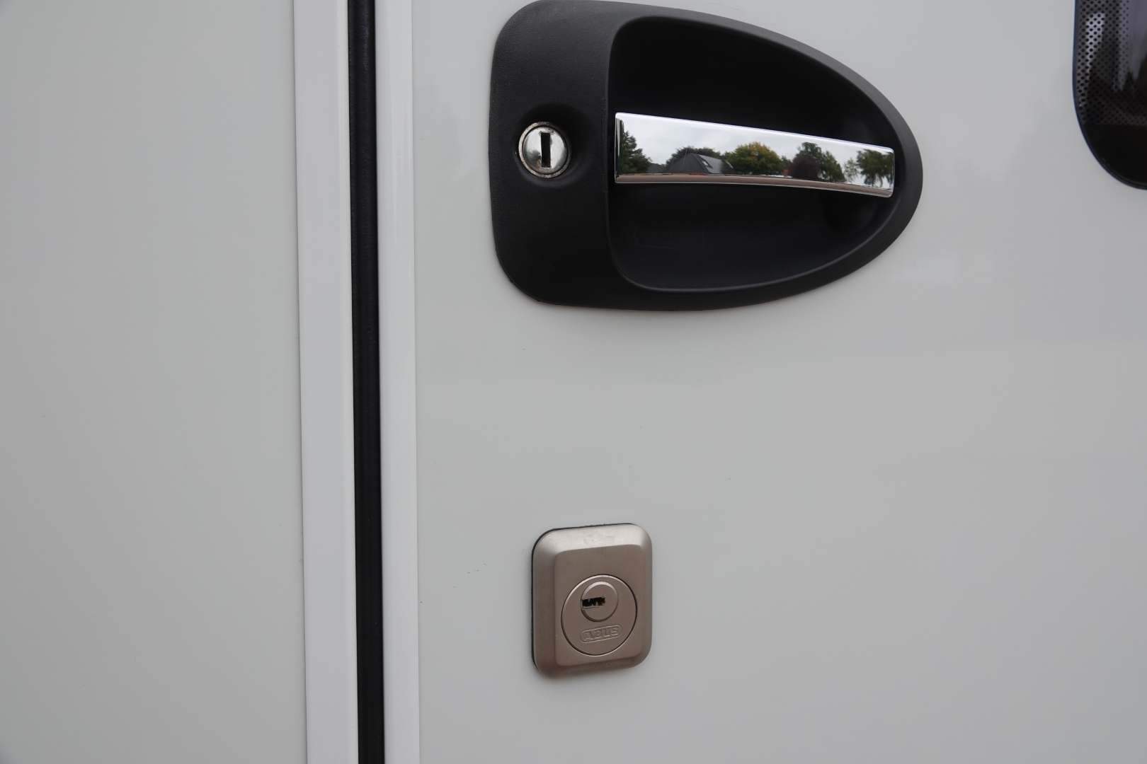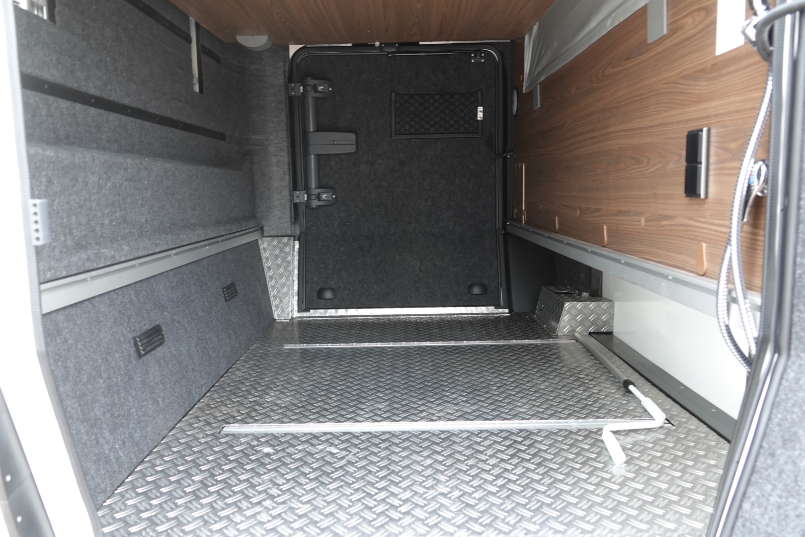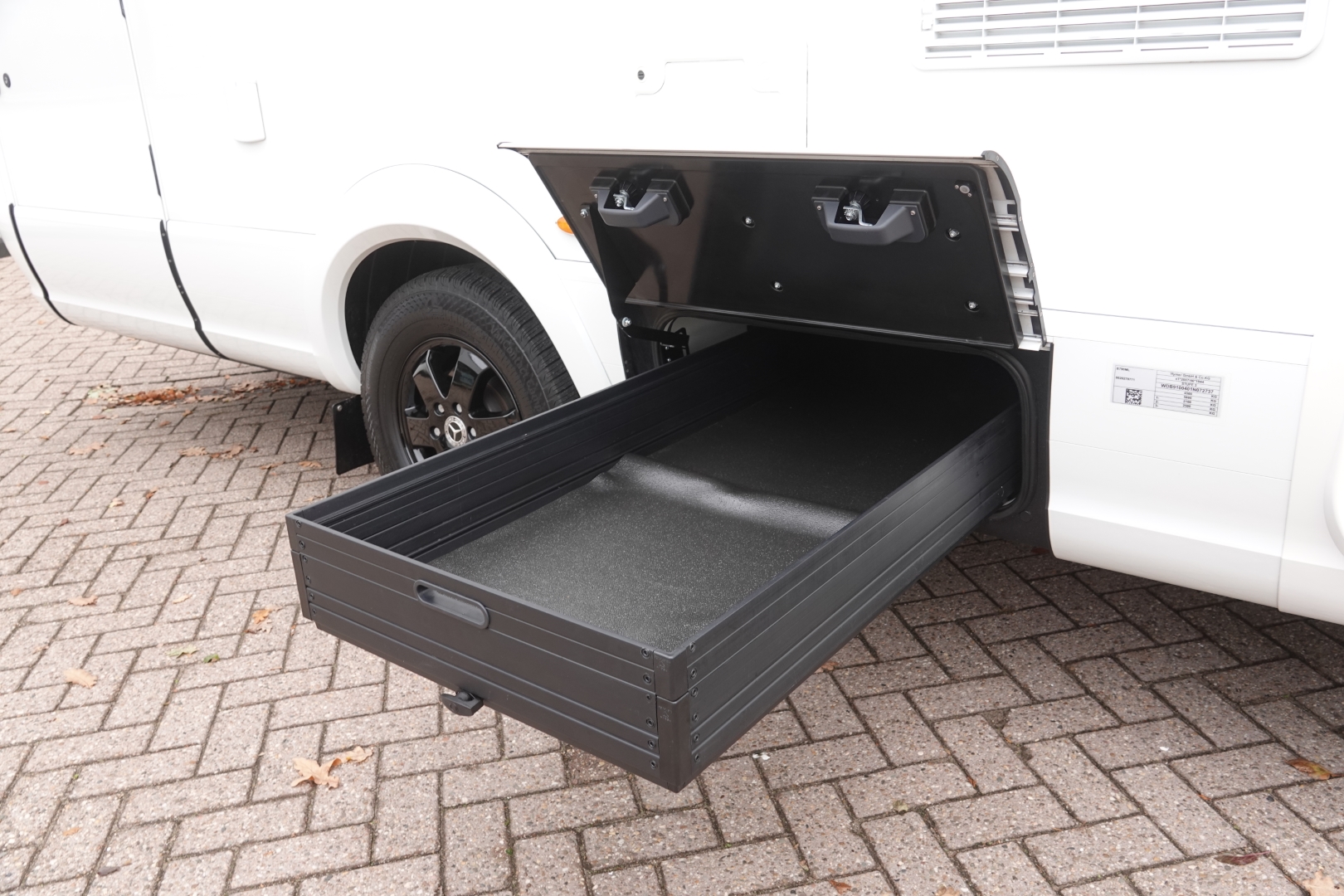 De camper heeft veel bergruimte in de ruime dubbele bodem bereikbaar dmv. verschillende luiken in de vloer en diverse kleppen buitenkant. Het bevat tevens een grote garage, met aan beide zijden een grote deur, waarin uw fietsen en bagage veilig binnen geplaatst kunnen worden. De 180 ltr schoon- en 150 ltr vuilwatertank bevinden zich in de (verwarmde) dubbele vloer.