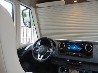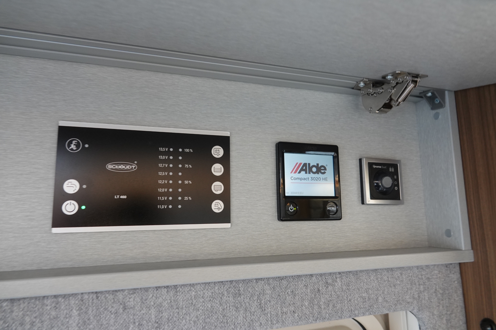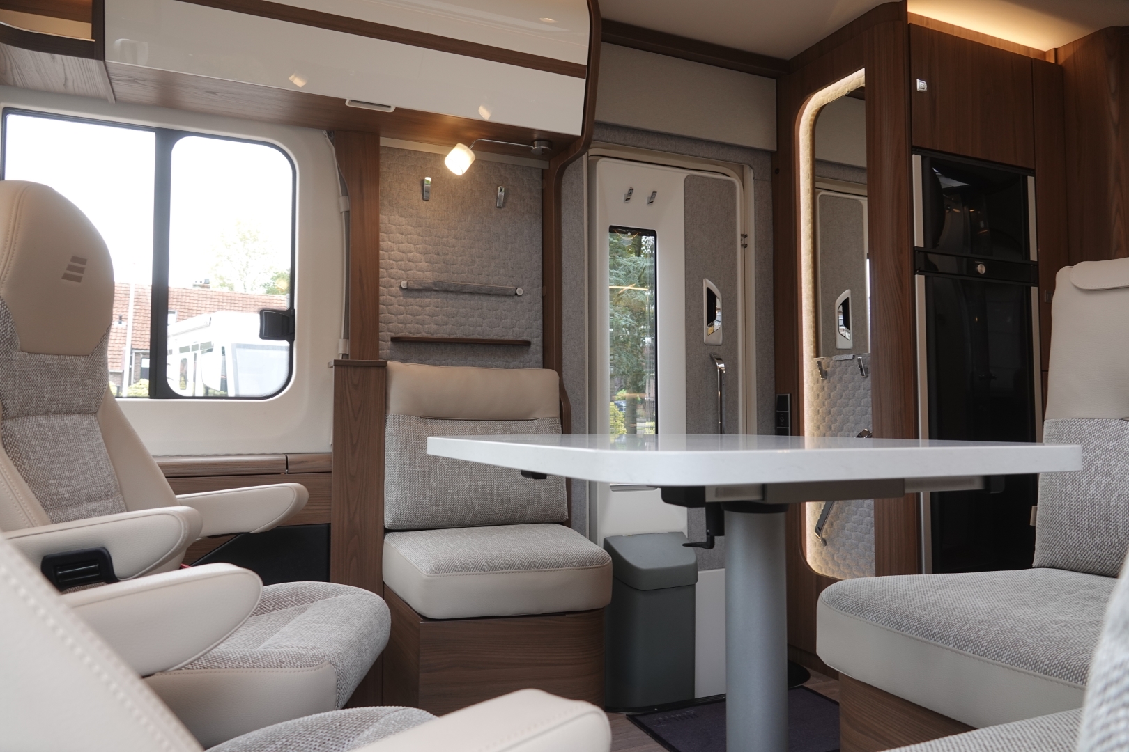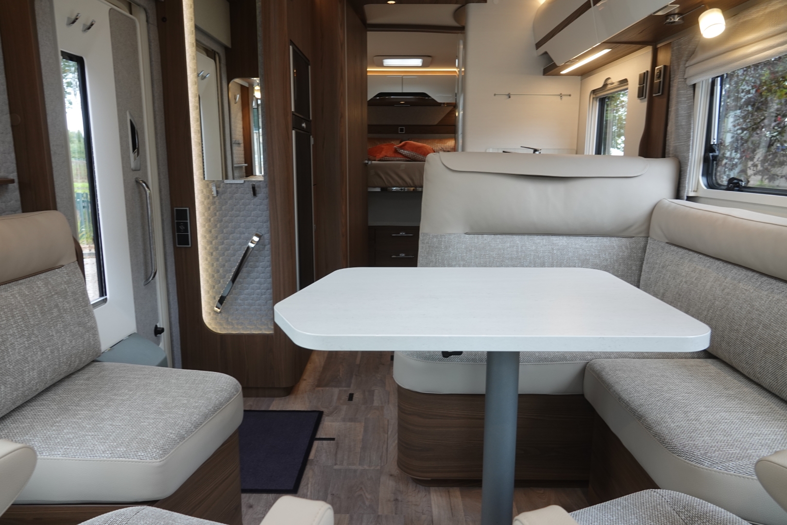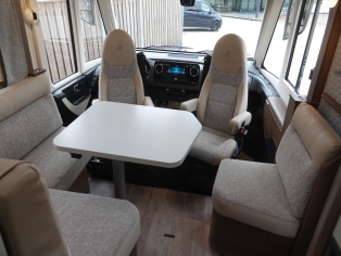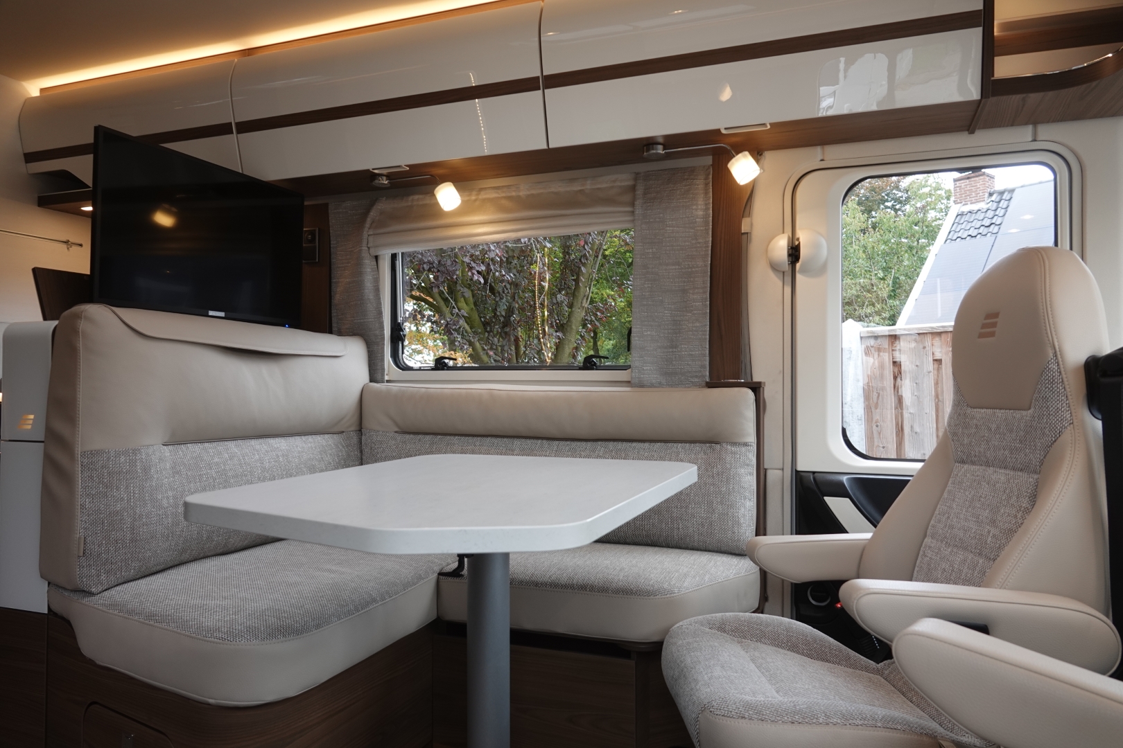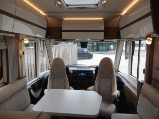 2 comfortabele Aguti Ergoflex pilotenstoelen in hoogte verstelbaar en kantelbaar, draaibaar naar een gezellige comfort L-zit met salontafel en zijbank. Het interieur bestaat uit het moderne meubeldesign Noce Cognac met de Creola stof bekleding met lederinleg wat in combinatie met de vele (indirecte) dimbare LED verlichting een bijzondere sfeer geeft. Het heeft bovenkastjes in plaats van een hefbed, wat een bijzonder ruime salon geeft met volledige stahoogte. Het geheel word verwarmd door het comfortabele ALDE 3020 HE vloeistof-verwarming. Cabineramen zijn voorzien van vouw- verduistering van hoogwaardig plisséstof. Het voorraam is voorzien van een elektrisch rolluik en jaloeziescherm.