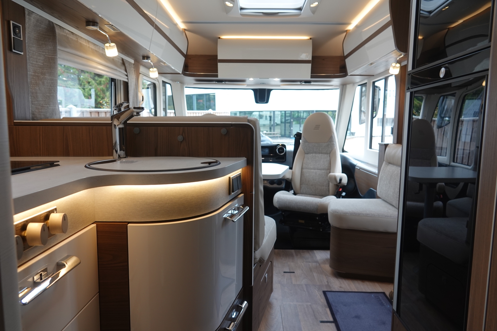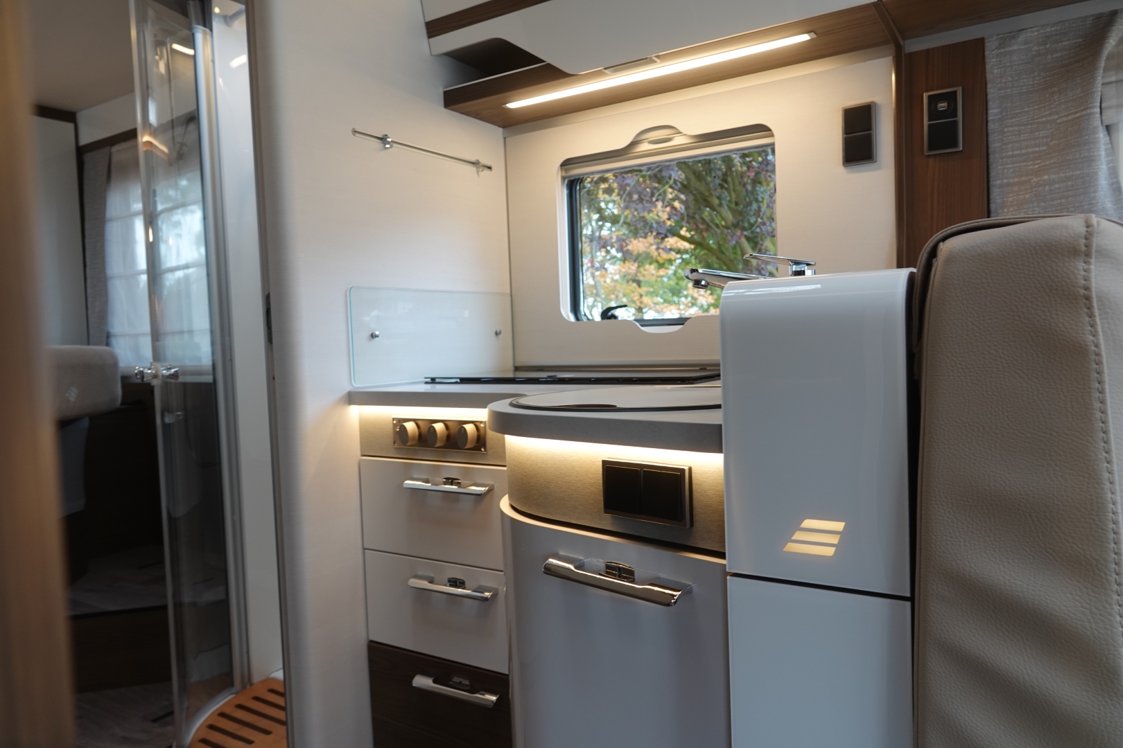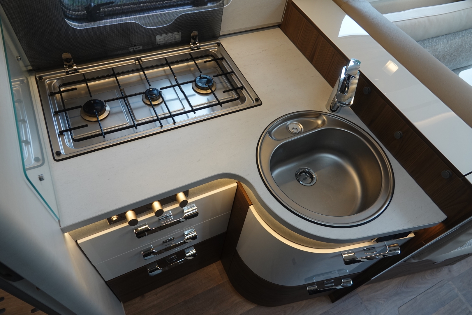 De royale keuken heeft een luxe keukenblad met spoelbak en 3 pits kooktoestel met automatische ontsteking, elektrische dakventilator erboven, diverse gelagerde laden met verrassend veel bergruimte voor het kookgerei en boodschappen, grote Dometic dubbeldeurs koelkast 160 ltr met aparte vriezer en automatische omschakeling van 220 V/12 V/gas