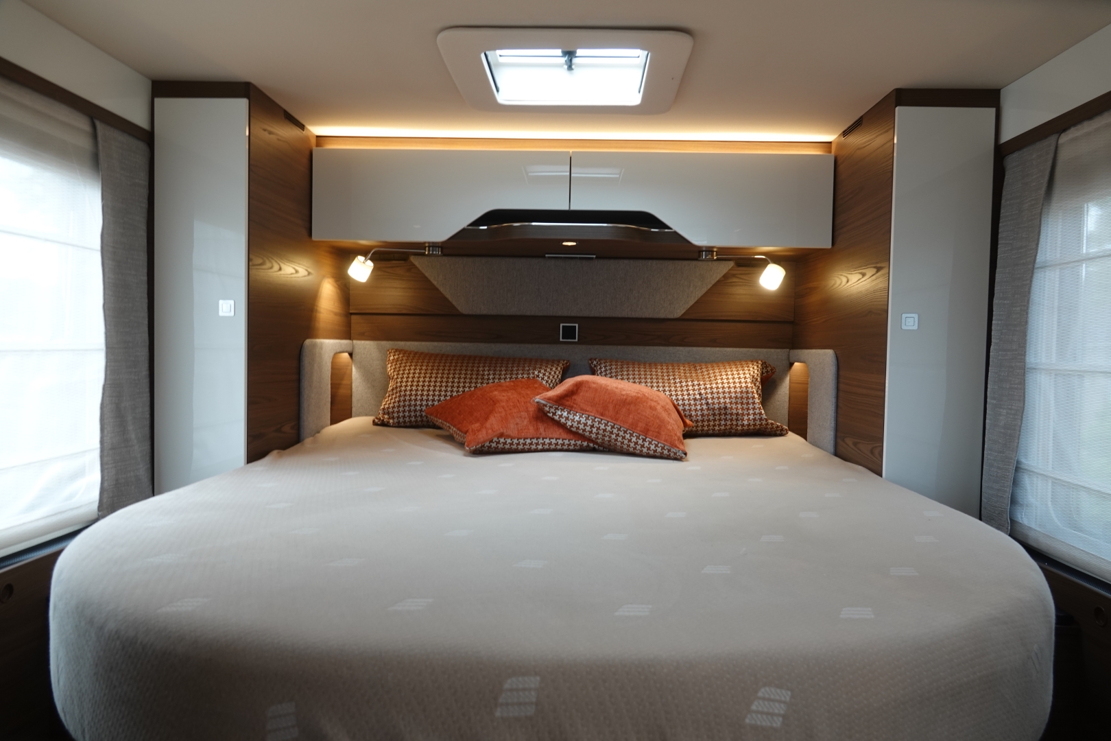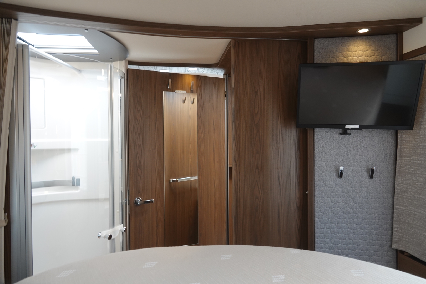 De slaapkamer heeft een royaal in hoogte verstelbaar Queens bed (155x200 cm), met het Hymer slaapcomfort systeem. Door de tussendeur te sluiten ontstaat er een ruime slaapkamer met sanitaire voorzieningen met veel privacy.