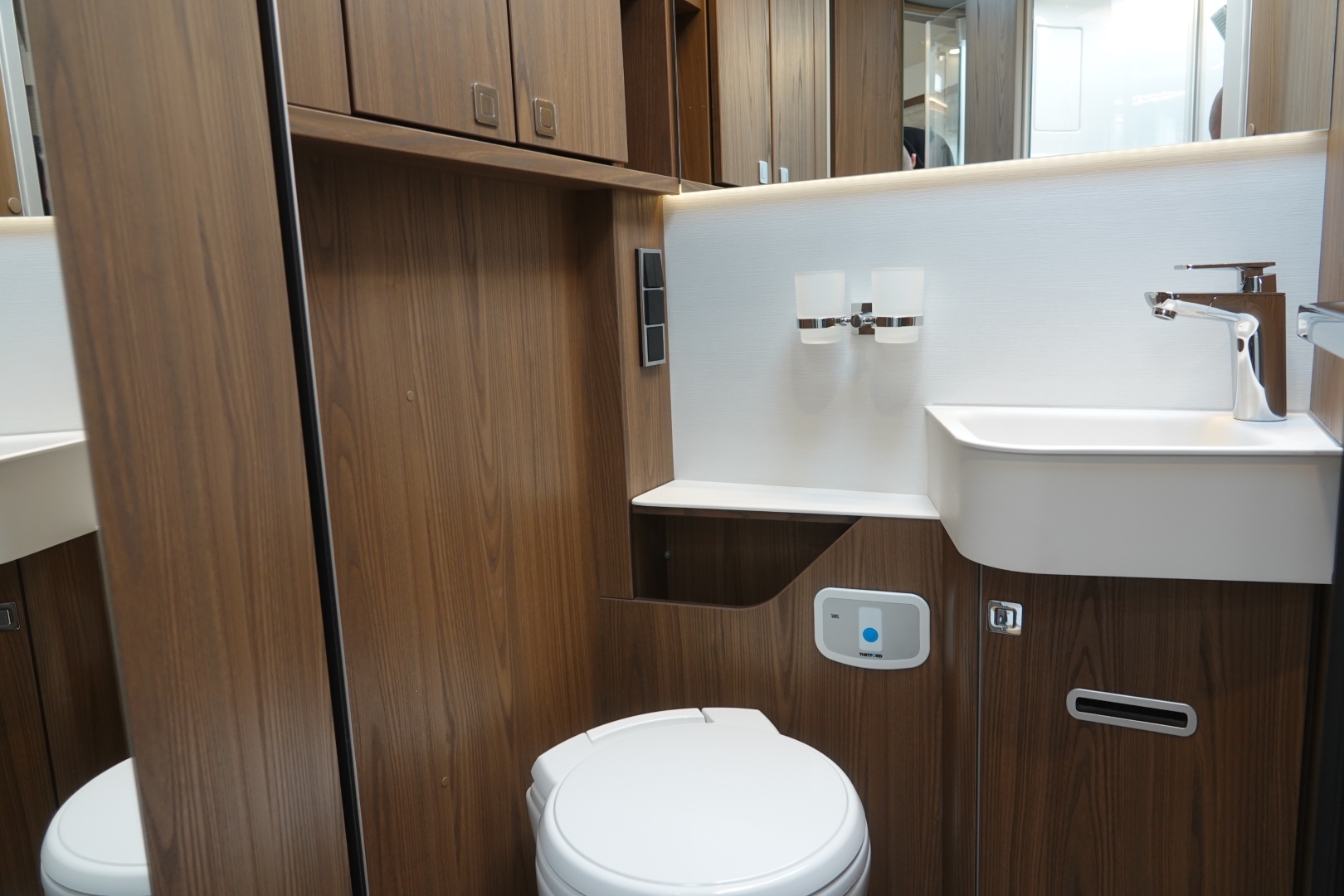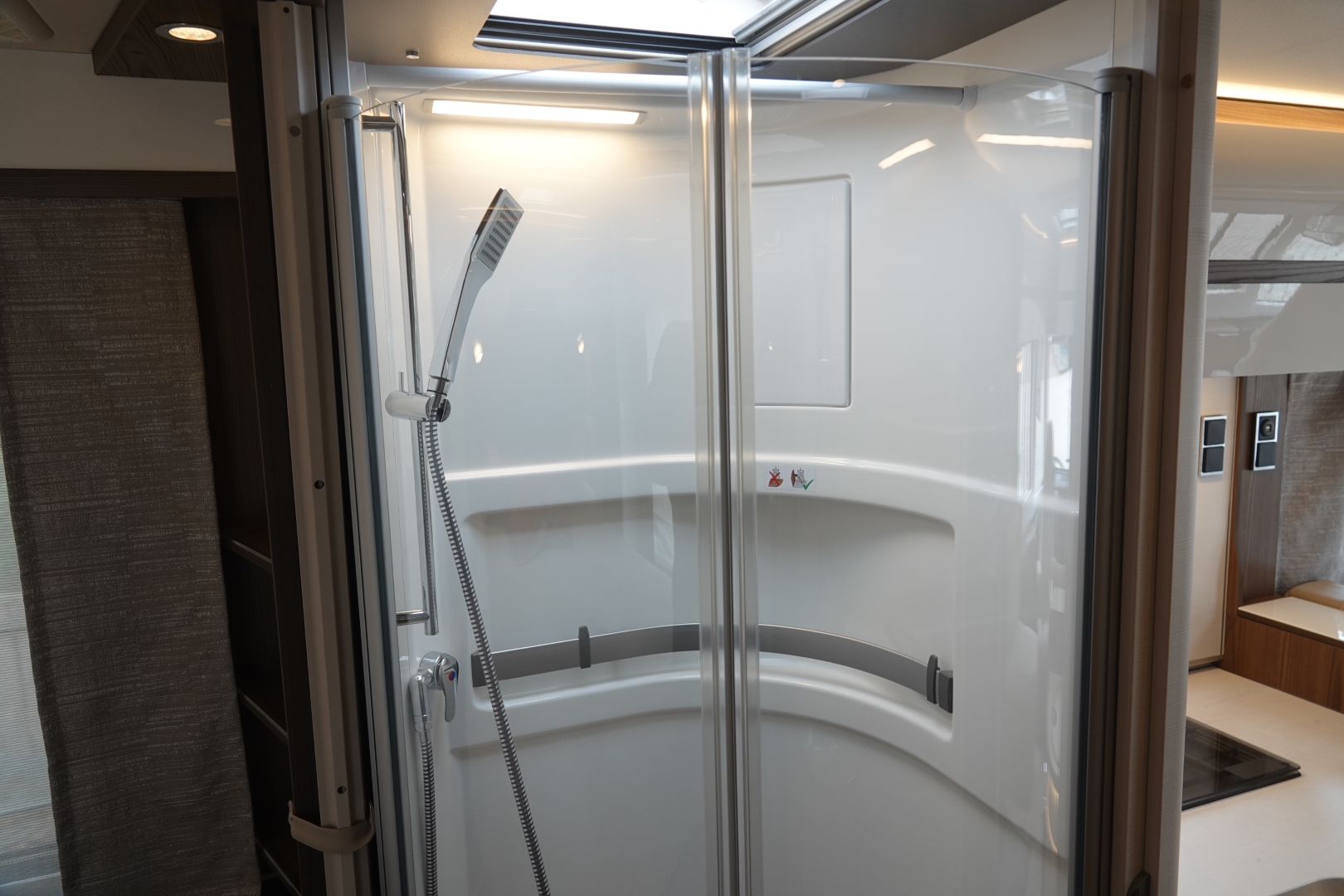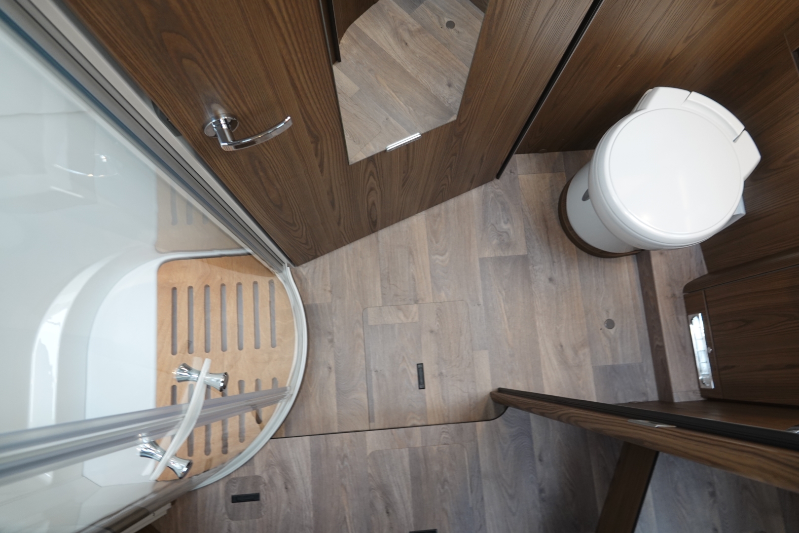 Links achterin bevind zich de ruime douchecabine, en er tegenover het keramisch toilet Thetford met extra kastruimte.