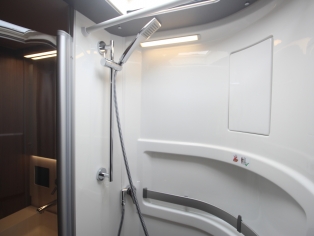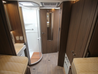 Links achterin bevind zich de ruime douchecabine, en er tegenover het toilet Thetford met SOG automatische toilet ontluchting en extra kastruimte.
