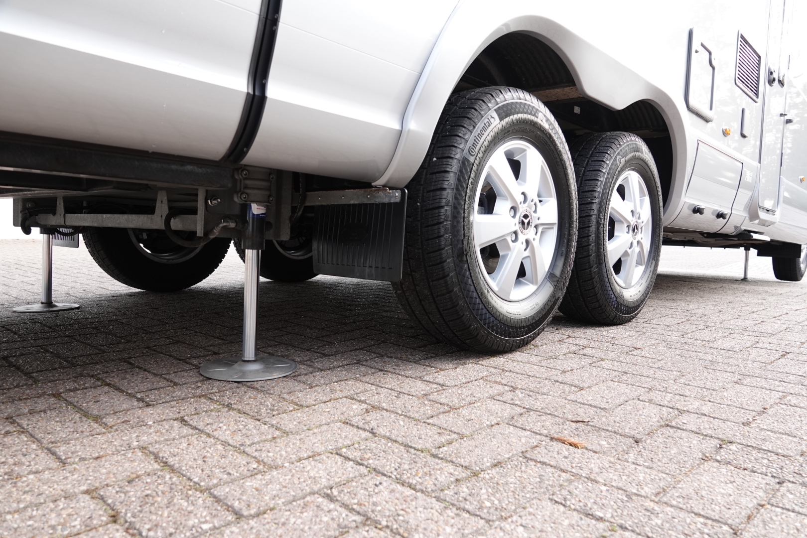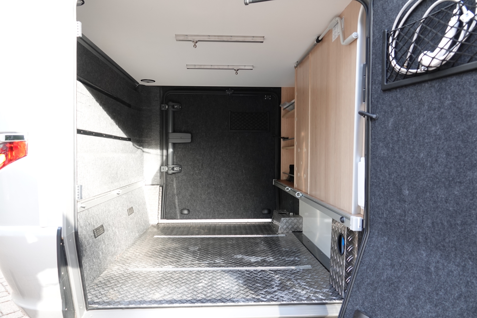 De camper heeft veel bergruimte in de ruime dubbele bodem bereikbaar dmv. verschillende luiken in de vloer en diverse kleppen buitenkant. Het bevat tevens een grote garage, met aan beide zijden een grote deur, waarin uw fietsen en bagage veilig binnen geplaatst kunnen worden. De 180 ltr schoon- en 150 ltr vuilwatertank bevinden zich in de (verwarmde) dubbele vloer.