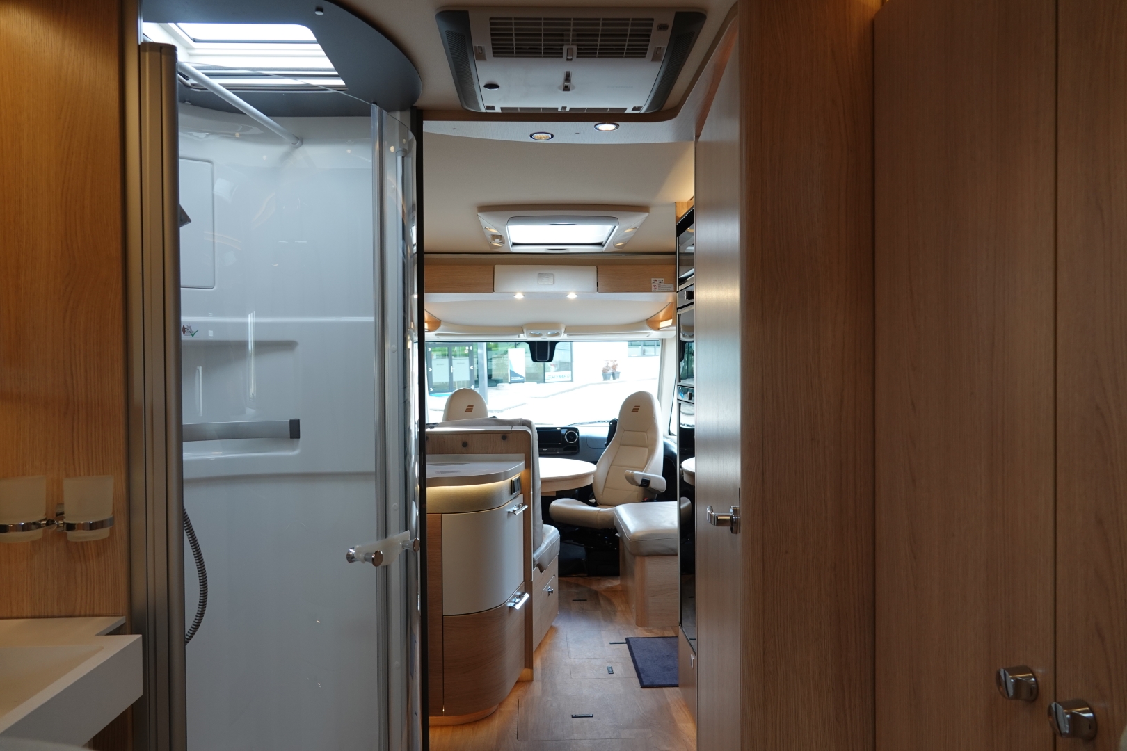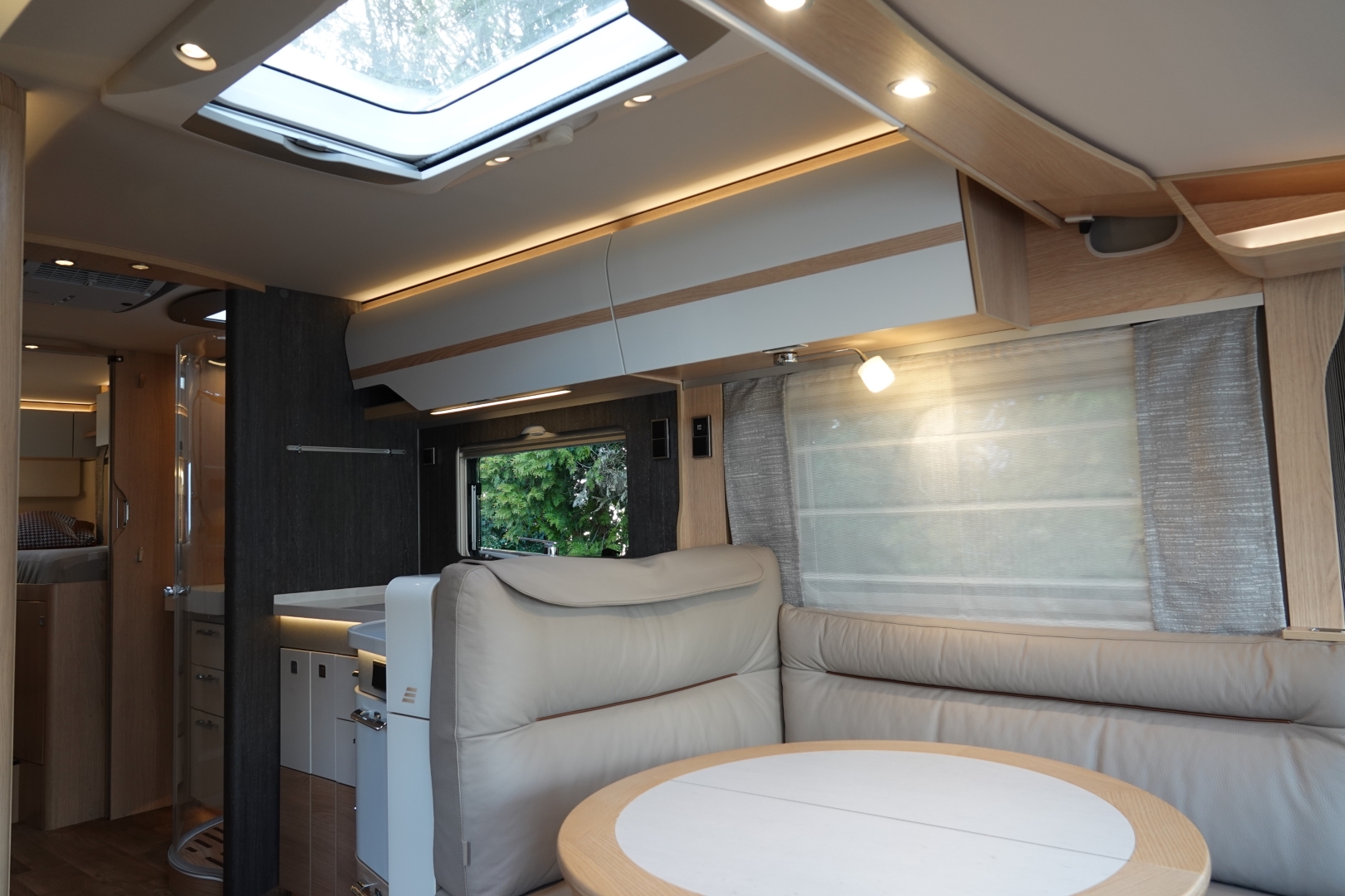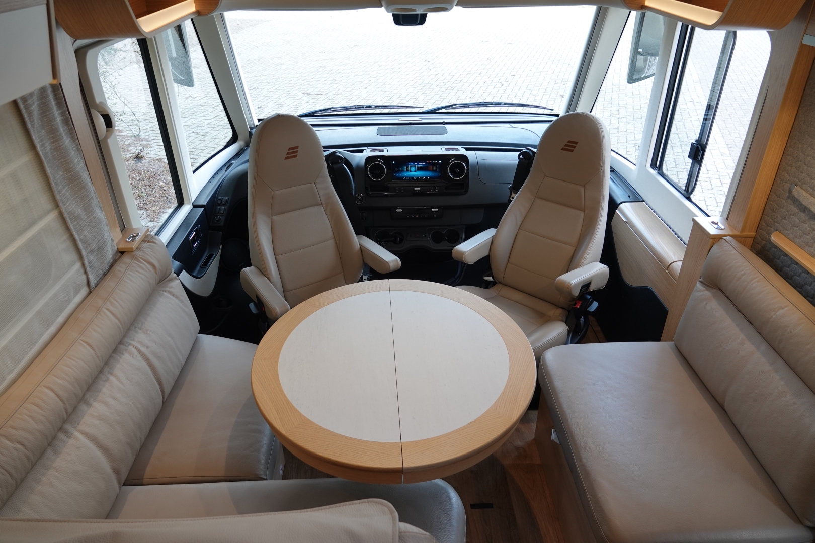 2 comfortabele, met leer beklede, Aguti Ergoflex pilotenstoelen in hoogte verstelbaar en kantelbaar, draaibaar naar een gezellige comfort L-zit met luxe salontafel. Het interieur bestaat uit het moderne meubeldesign Grand Oak met de luxe lederen bekleding wat in combinatie met de vele (indirecte) LED verlichting een bijzondere sfeer geeft. Het geheel word verwarmd door het comfortabele ALDE 3020 HE vloeistof-verwarming. Cabineramen zijn voorzien van vouw- verduistering van hoogwaardig plisséstof. Het voorraam word verduistert dmv. een elektrisch rolluik. Het interieur is heerlijk koel te houden met de Truma Aventa dakairco.