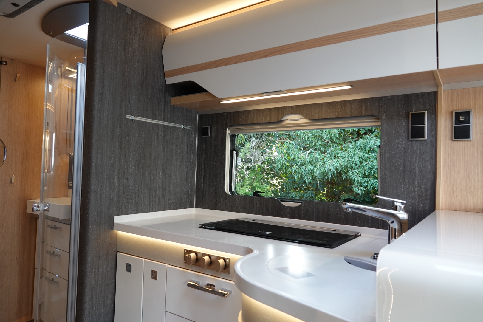 De royale keuken heeft een luxe keukenblad van mineraalstof met spoelbak en 3 pits kooktoestel met automatische ontsteking, diverse gelagerde laden met verrassend veel bergruimte voor het kookgerei en boodschappen, grote koelkast 140 ltr met aparte vriezer en automatische energiekeuze en oven.