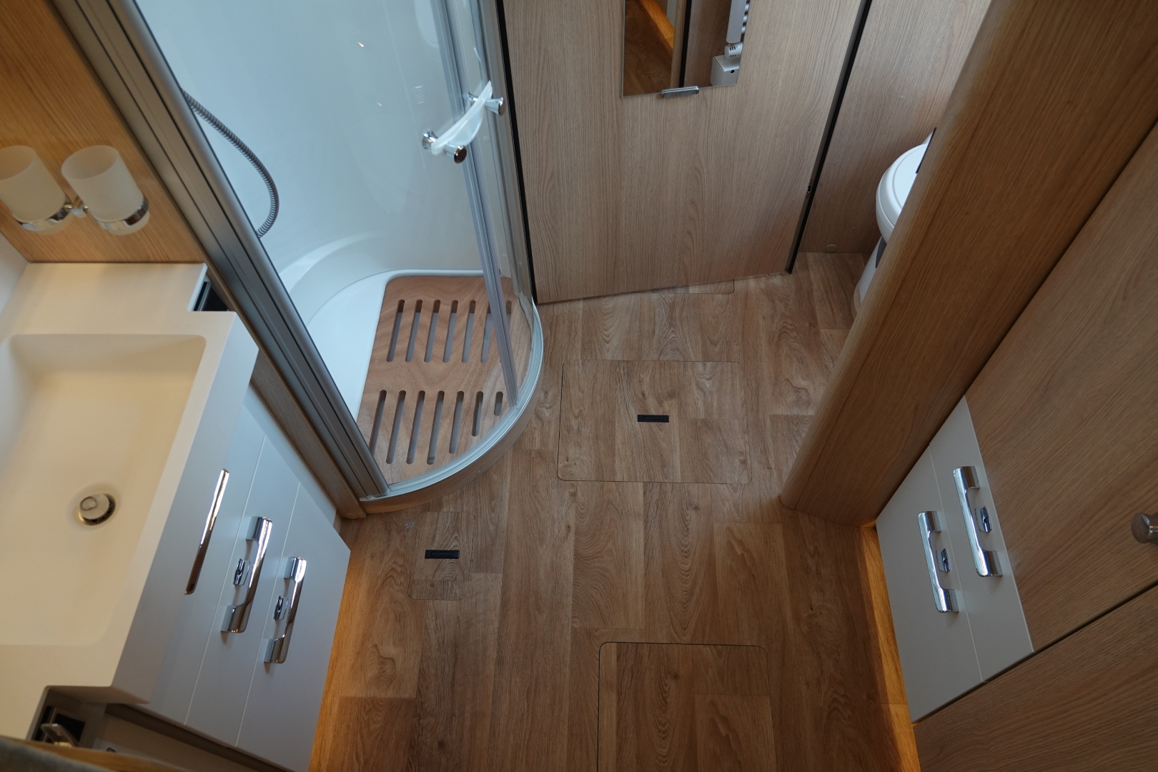 Links achterin bevind zich de ruime douchecabine, en er tegenover het toilet Thetford met SOG automatische toilet ontluchting en extra kastruimte.
