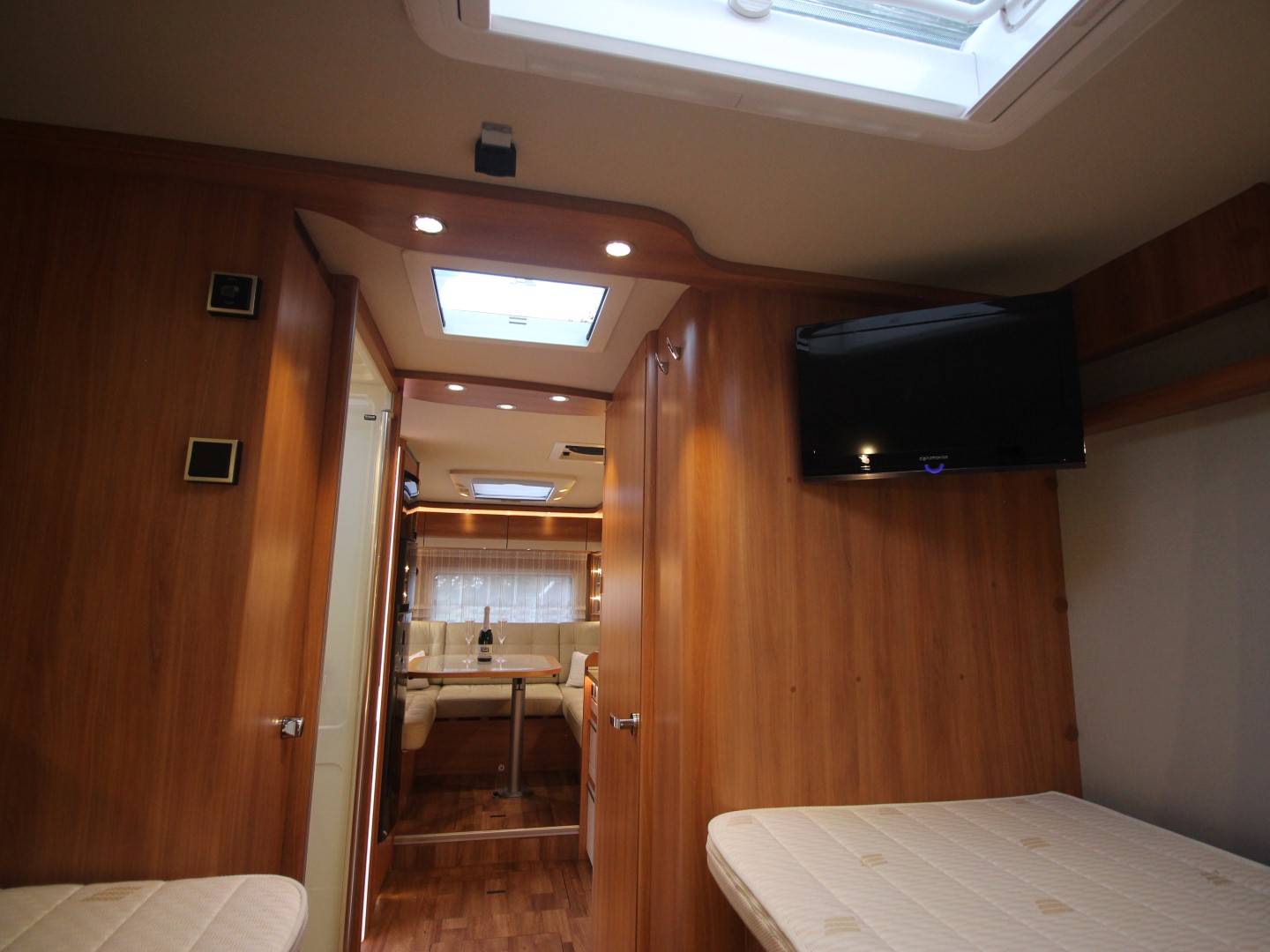 De DUO MOBIL heeft een bijzondere indeling; Voorin bevindt zich een neerlaatbaar hefbed, dat in een handomdraai door uittrekbare voetsteunen ook tot twee eenpersoonsbedden met een lengte van 2,06m omgevormd kan worden. Een dakluik van helder glas zorgt altijd voor frisse lucht. De uittrekbare trap met twee treden, waarmee u het multifunctionele hefbed gemakkelijk bereikt, biedt bovendien extra opbergruimte.